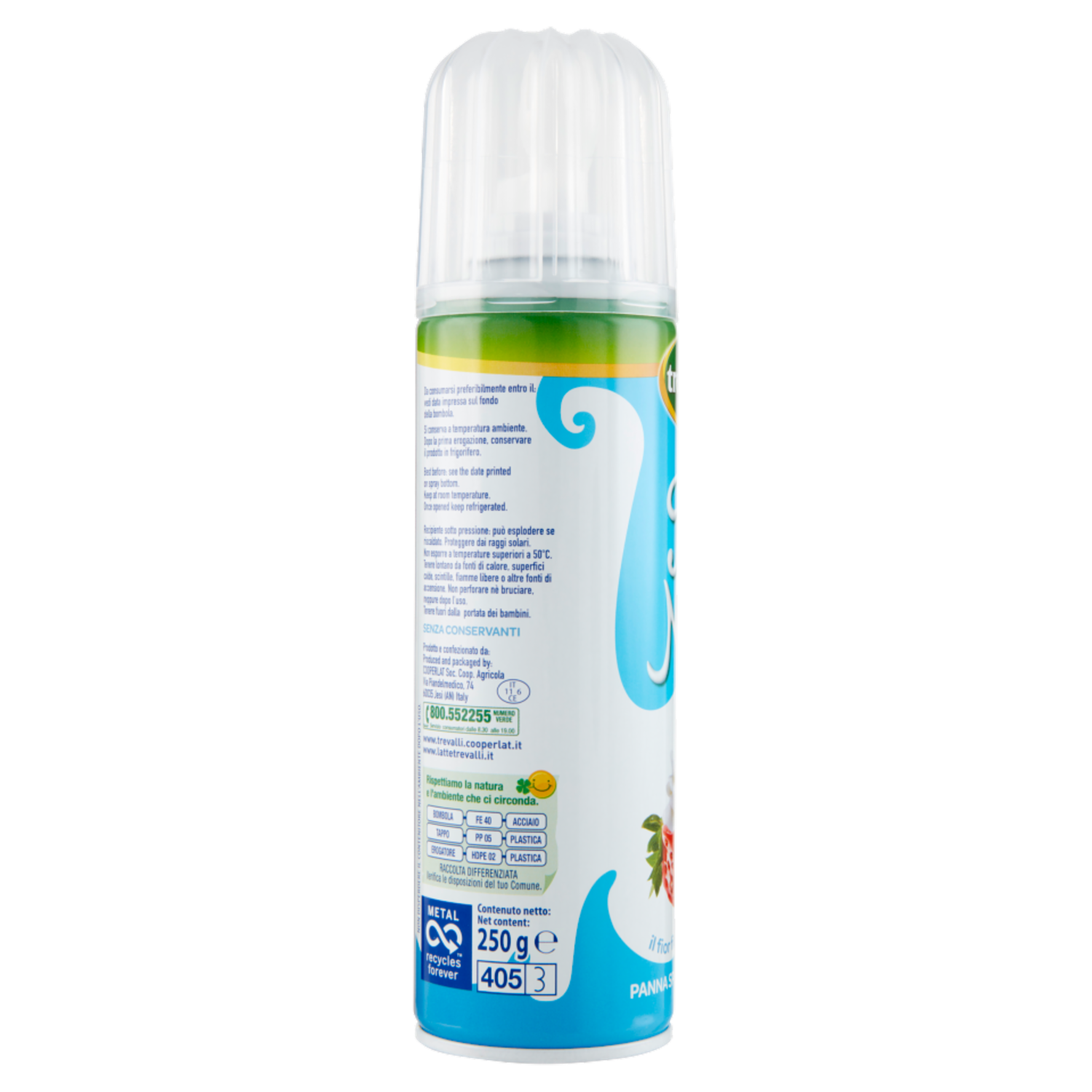 Istruzioni per l'uso 1. Per una migliore resa, prima dell'utilizzo mettere la bombola in frigorifero (non in freezer). 2. Agitare bene prima dell'uso. 3. Capovolgere la bombola in posizione verticale e premere con una leggera pressione l'erogatore. 4. Dopo l'uso, rovesciare l'erogatore e lavarlo sotto un getto di acqua corrente.