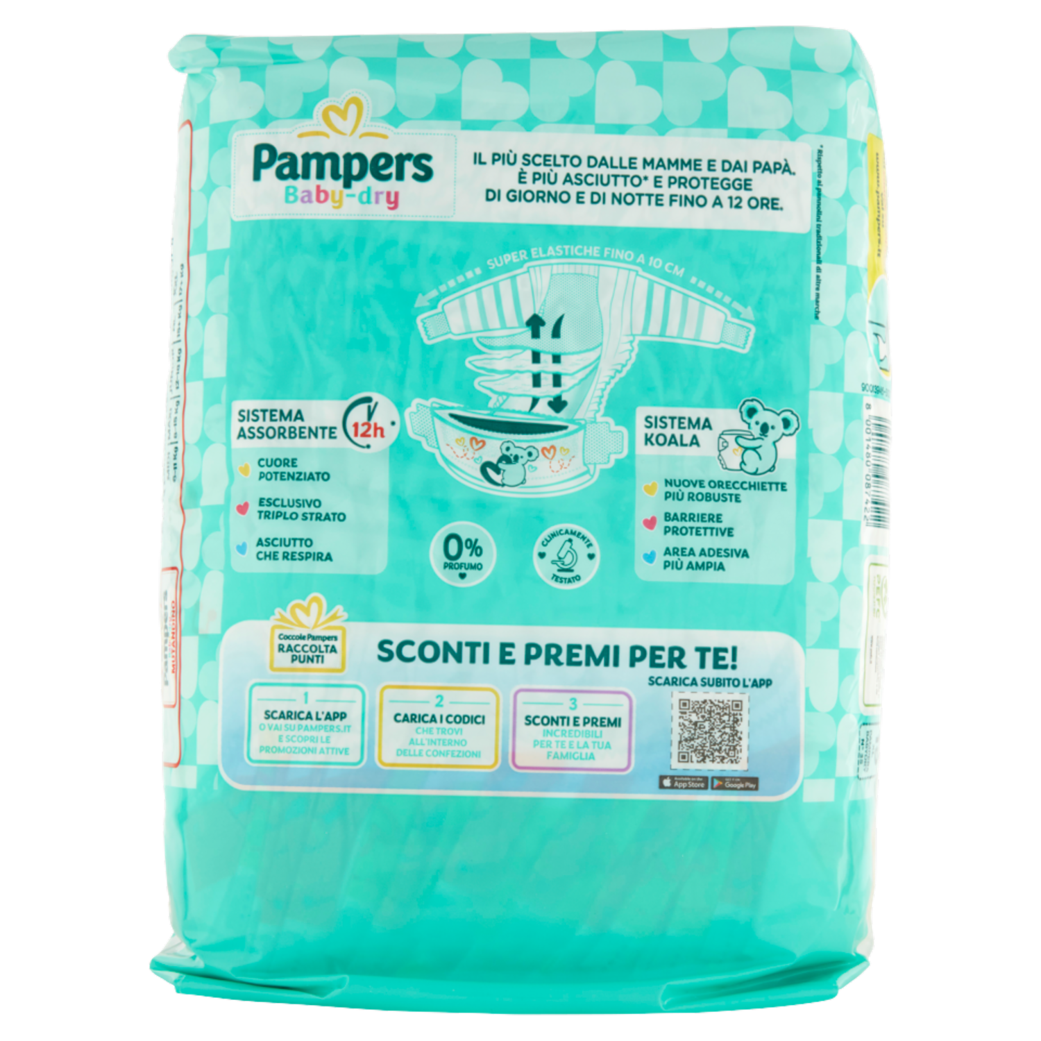 Pampers Baby-dry Il più scelto dalle mamme e dai papà. È più asciutto* e protegge di giorno e di notte fino a 12 ore. * Rispetto ai pannolini tradizionali di altre marche Sistema assorbente 12h - Cuore potenziato - Esclusivo triplo strato - Asciutto che respira Sistema koala - Nuove orecchiette più robuste - Barriere protettive - Area adesiva più ampia 0% Profumo Clinicamente testato