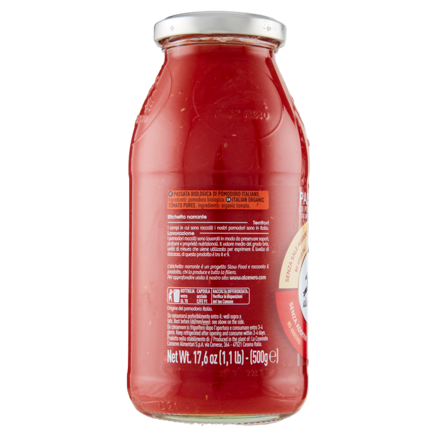 Etichetta narrante Territori I campi in cui sono raccolti i nostri pomodori sono in Italia. Lavorazione I pomodori raccolti sono lavorati in modo da preservare sapori, profumi e proprietà nutrizionali. Il valore medio del grado brix, unità di misura che viene utilizzata per esprimere il livello di dolcezza, di questo prodotto è tra 8 e 9. L'etichetta narrante è un progetto Slow Food e racconta il prodotto, chi lo produce e tutta la filiera. Per approfondire visita il nostro sito: www.alcenero.com