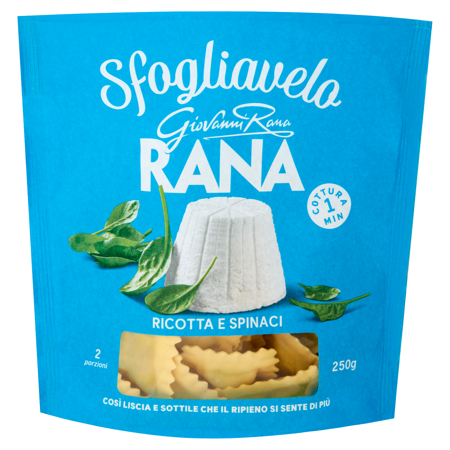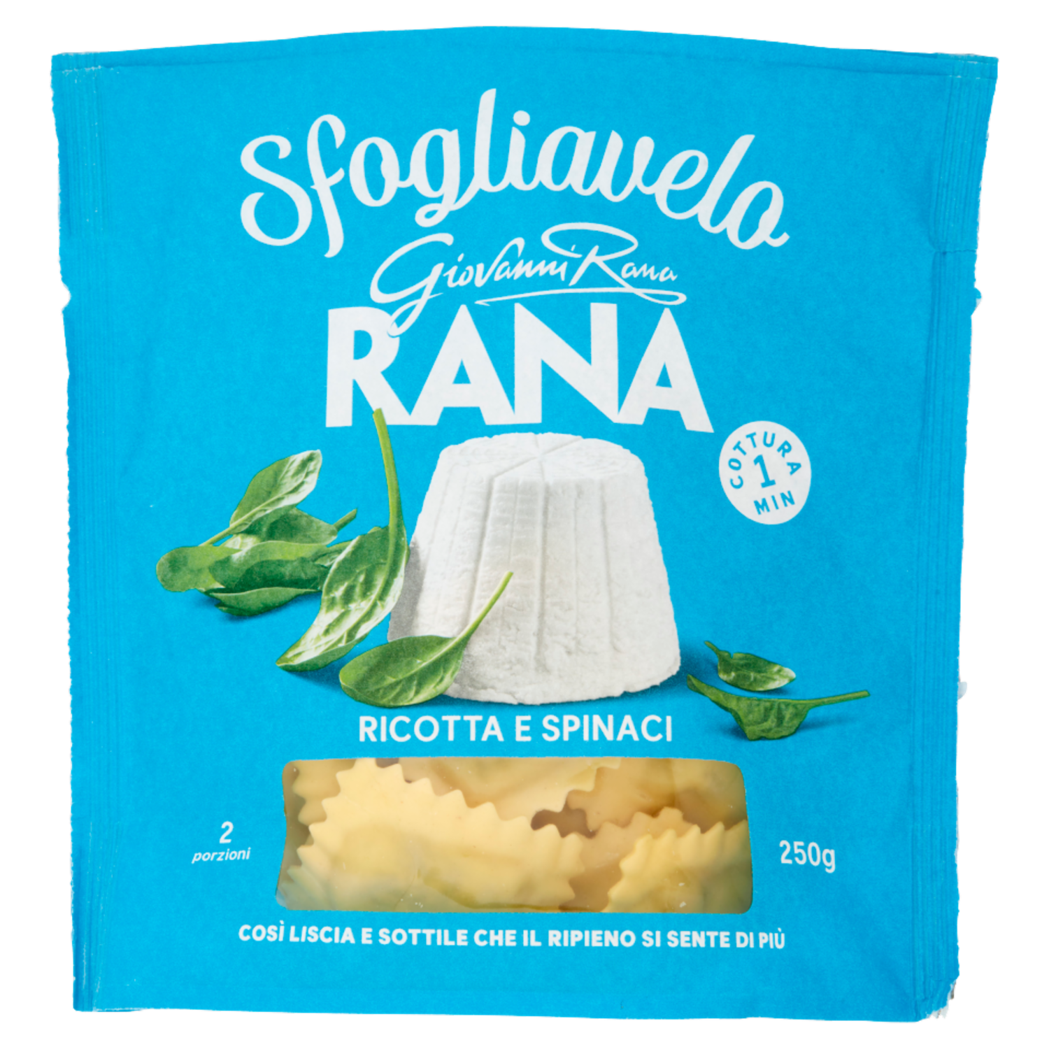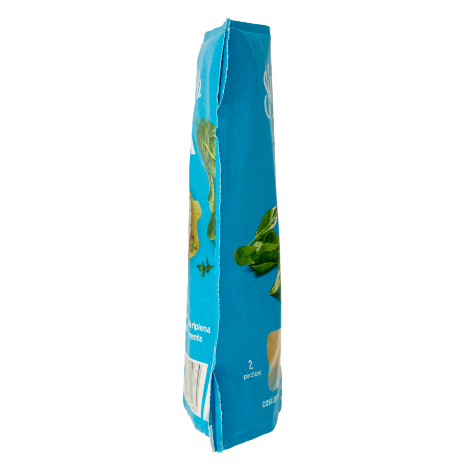 Ripieno 60%: ricotta 40% (siero di latte, latte, sale), spinaci 16%, formaggio mascarpone, siero di latte in polvere, crema di latte, formaggio Parmigiano Reggiano DOP*, pangrattato (farina di grano tenero, acqua, sale, lievito), olio di girasole, sale, aromi naturali, fibra di frumento, aglio