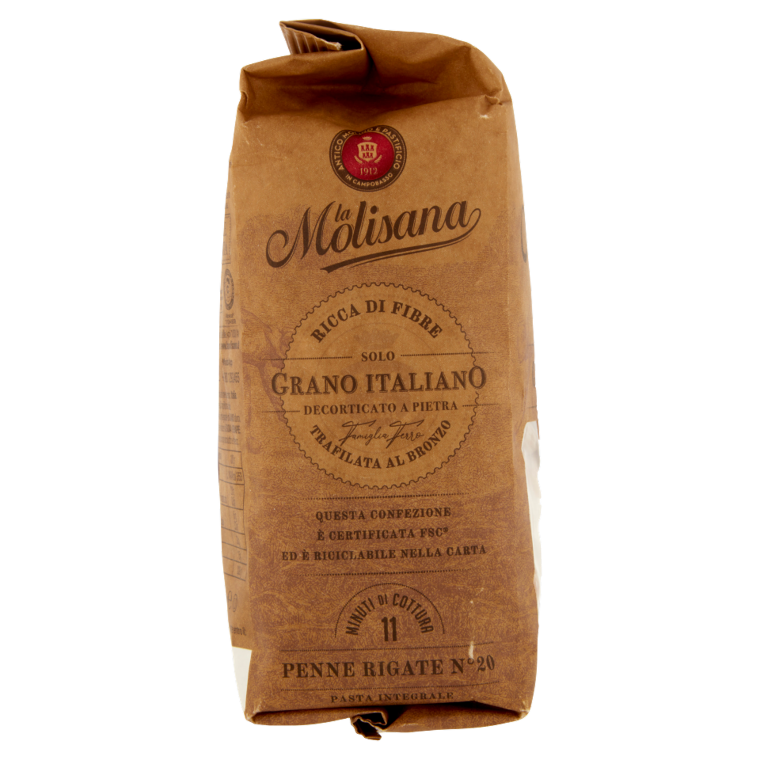 La Molisana Antico Molino e Pastificio in Campobasso 1912 Famiglia Ferro Azienda 100% italiana da filiera integrata Fondata nel 1912 da una famiglia di imprenditori italiani, interamente di proprietà italiana. Il grano Utilizziamo solo grano coltivato in Molise, Abruzzo, Puglia, Lazio e Marche, regioni da sempre vocate alla produzione di grano duro di alta qualità. Il molino Maciniamo da cinque generazioni il miglior grano, lo decortichiamo a pietra per produrre semole più sicure dal punto di vista igienico-sanitario. Il pastificio Trafiliamo al bronzo per ottenere una pasta ruvida e tenace con un'eccellente tenuta in cottura. L'acqua Impastiamo le nostre semole con acqua pura, iposodica con caratteristiche oligominerali delle sorgenti del Matese. LifeGate impatto zero CO₂ La Molisana partecipa al progetto Impatto Zero di LifeGate grazie al quale sono state calcolate, ridotte e compensate le emissioni di CO2 prodotte da questa confezione tramite l'acquisto di crediti di carbonio generati dalla creazione e tutela di foreste in crescita in Madagascar, Brasile e Italia. Ricca di fibre Acqua cristallina di sorgente Mugnai da cinque generazioni