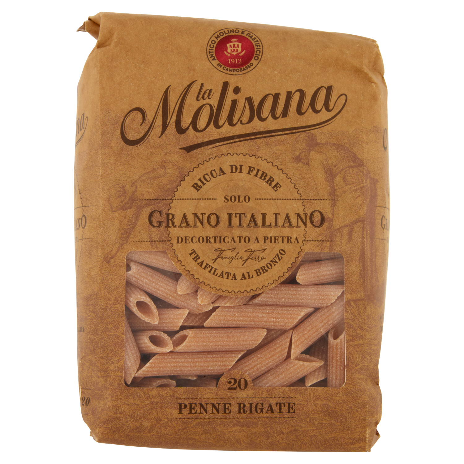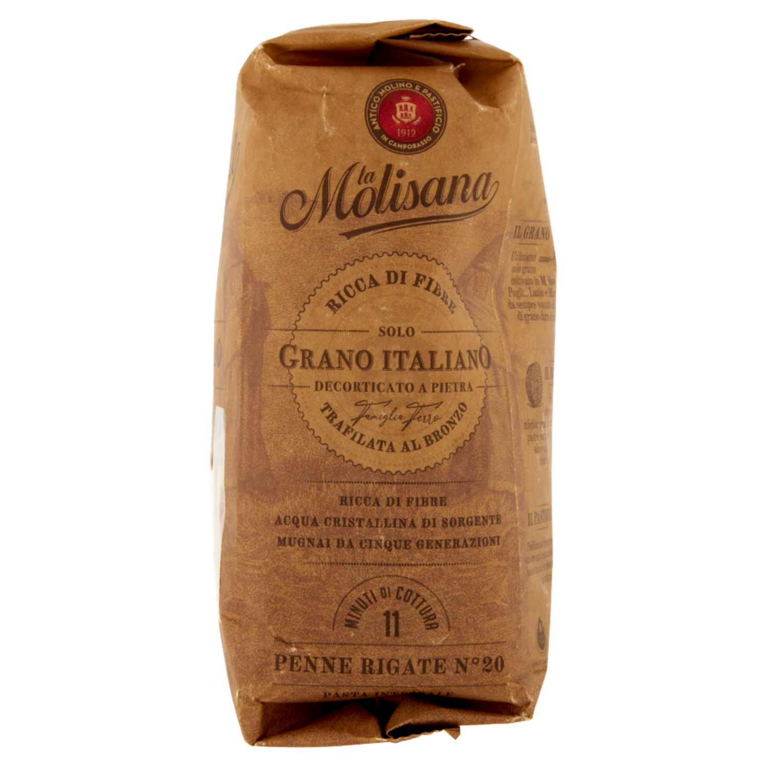 La Molisana Antico Molino e Pastificio in Campobasso 1912 Famiglia Ferro Azienda 100% italiana da filiera integrata Fondata nel 1912 da una famiglia di imprenditori italiani, interamente di proprietà italiana. Il grano Utilizziamo solo grano coltivato in Molise, Abruzzo, Puglia, Lazio e Marche, regioni da sempre vocate alla produzione di grano duro di alta qualità. Il molino Maciniamo da cinque generazioni il miglior grano, lo decortichiamo a pietra per produrre semole più sicure dal punto di vista igienico-sanitario. Il pastificio Trafiliamo al bronzo per ottenere una pasta ruvida e tenace con un'eccellente tenuta in cottura. L'acqua Impastiamo le nostre semole con acqua pura, iposodica con caratteristiche oligominerali delle sorgenti del Matese. LifeGate impatto zero CO₂ La Molisana partecipa al progetto Impatto Zero di LifeGate grazie al quale sono state calcolate, ridotte e compensate le emissioni di CO2 prodotte da questa confezione tramite l'acquisto di crediti di carbonio generati dalla creazione e tutela di foreste in crescita in Madagascar, Brasile e Italia. Ricca di fibre Acqua cristallina di sorgente Mugnai da cinque generazioni