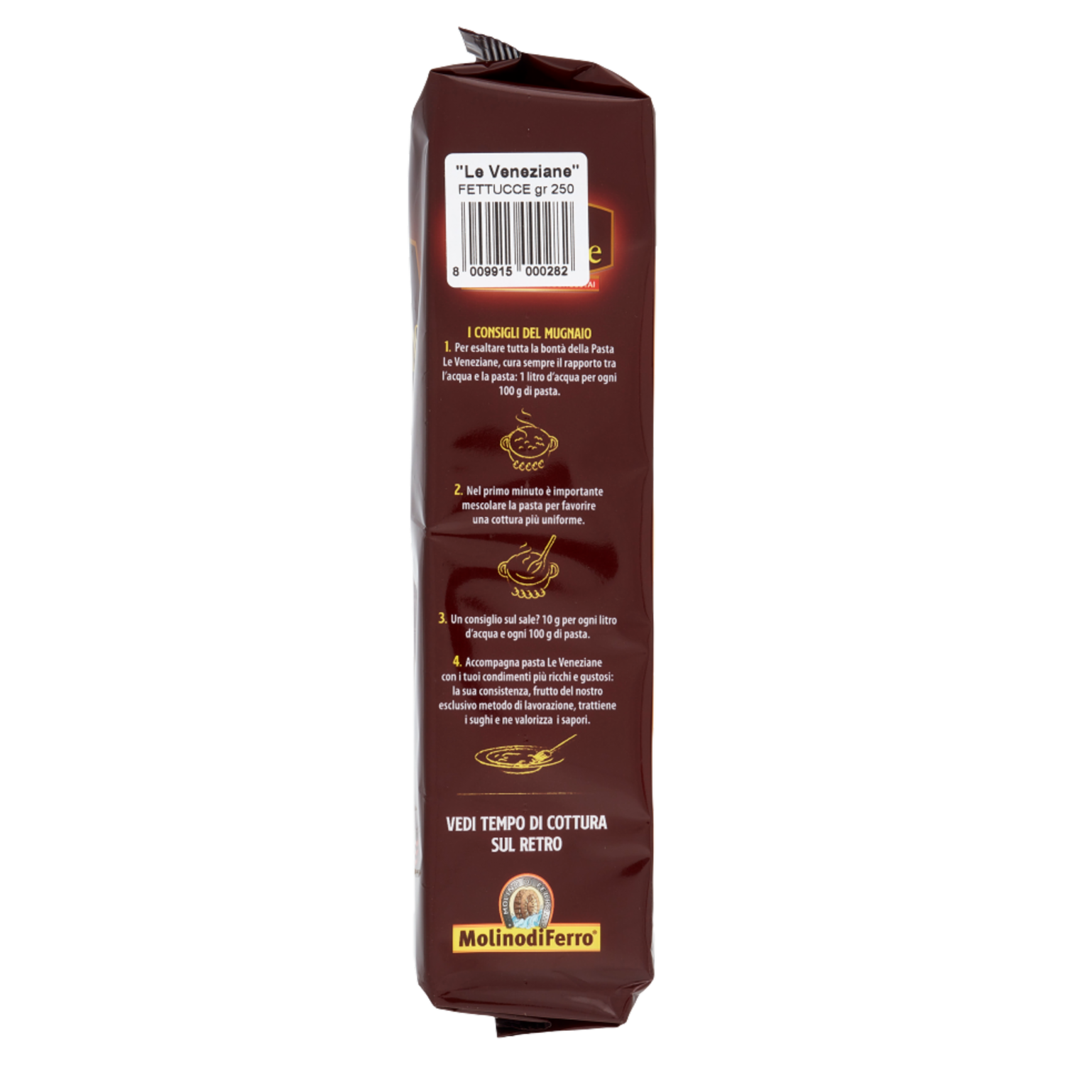 Tempo di cottura: 6/7 min I consigli del mugnaio 1. Per esaltare tutta la bontà della Pasta Le Veneziane, cura sempre il rapporto tra l'acqua e la pasta: 1 litro d'acqua per ogni 100 g di pasta. 2. Nel primo minuto è importante mescolare la pasta per favorire una cottura più uniforme. 3. Un consiglio sul sale? 10 g per ogni litro d'acqua e ogni 100 g di pasta. 4. Accompagna pasta Le Veneziane con i tuoi condimenti più ricchi e gustosi: la sua consistenza, frutto del nostro esclusivo metodo di lavorazione, trattiene i sughi e ne valorizza i sapori.