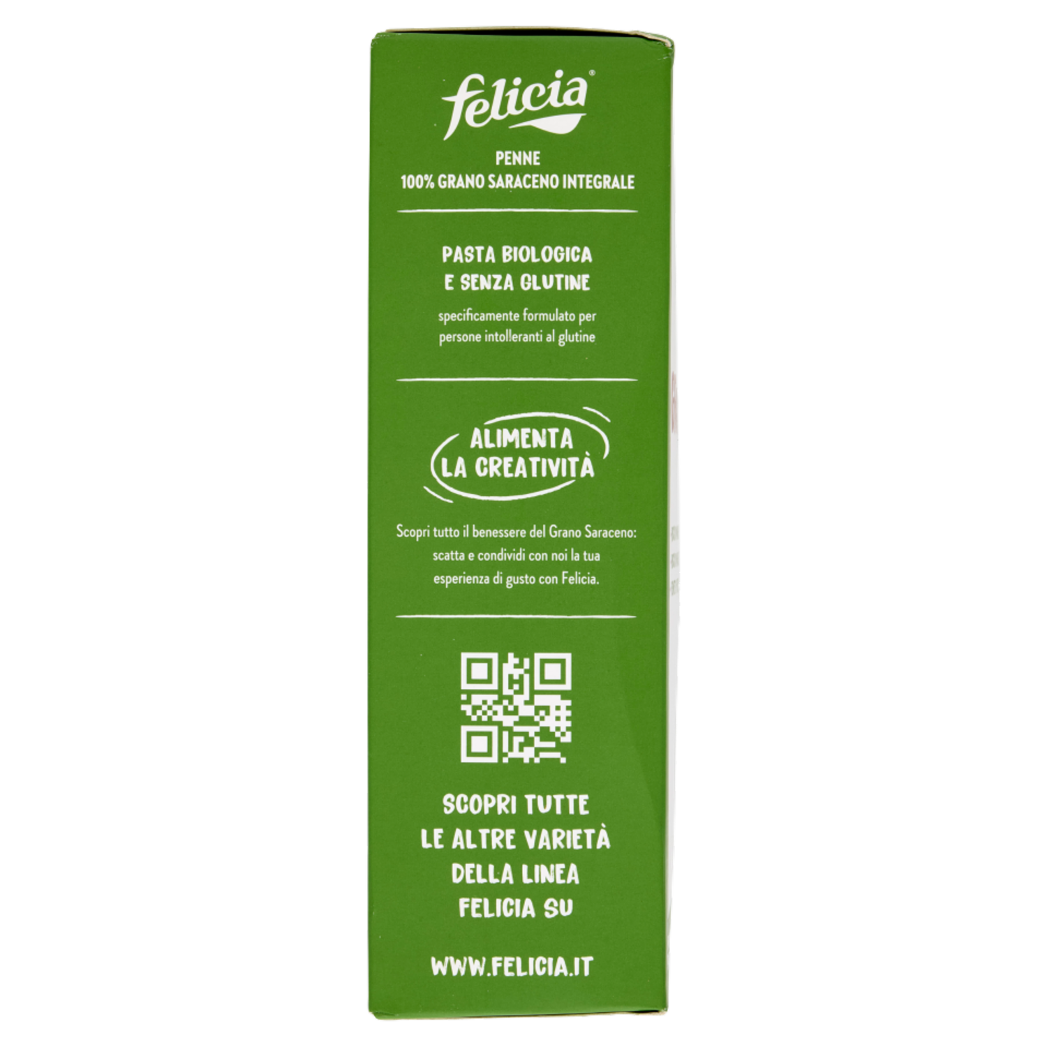 La nuova frontiera del gusto La pasta di Grano Saraceno Felicia è ricca di sali minerali, magnesio e manganese. Il magnesio contribuisce al normale metabolismo energetico, alla normale funzione muscolare, al mantenimento di ossa normali e contribuisce altresì alla normale funzione psicologica. La migliore scelta varietale, da agricoltura biologica Felicia seleziona solo materie prime naturalmente senza glutine e ricche di preziosi nutrienti, attuando sempre la miglior scelta varietale. Da agricoltura biologica. Il nostro Osservatorio Nutrizionale offre al consumatore approfondite ricerche e studi sull'alimentazione. Alimentiamo l'ottimismo Buona sempre e per tutti coloro che scelgono di mangiar sano e naturale senza rinunciare al gusto. 1 solo ingrediente: 100% farina di grano saraceno integrale bio per una pasta dal gusto deciso che rievoca gli antichi sapori della tradizione. Varia la tua alimentazione per affrontare la giornata con ottimismo ed energia. Sicurezza a 360° Prodotto nell'unico pastificio italiano allergen free con molino multigrain integrato. Garanzia e controllo, dal cereale alla pasta, per offrire un prodotto sicuro e di alta qualità. Prodotto in uno stabilimento dedicato al senza glutine Pasta biologica e senza glutine specificamente formulato per persone intolleranti al glutine