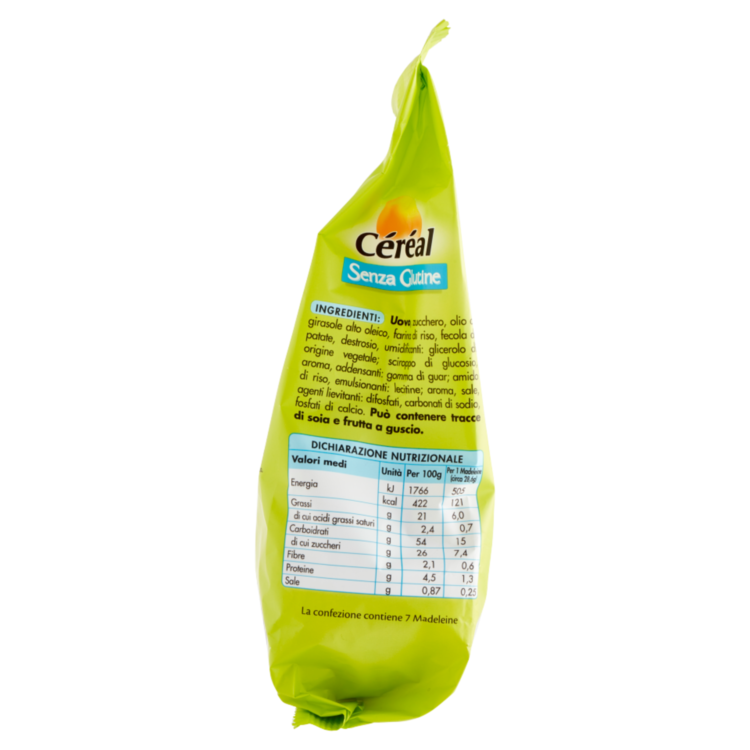 Céréal si impegna per voi Le Madeleine Céréal sono prodotte con la massima cura: - Senza Glutine - Naturalmente Senza Lattosio - Senza Latte - Senza Olio di Palma - Con uova da galline allevate all'aperto Si consiglia di utilizzare il prodotto nell'ambito di una dieta varia ed equilibrata ed uno stile di vita sano.
