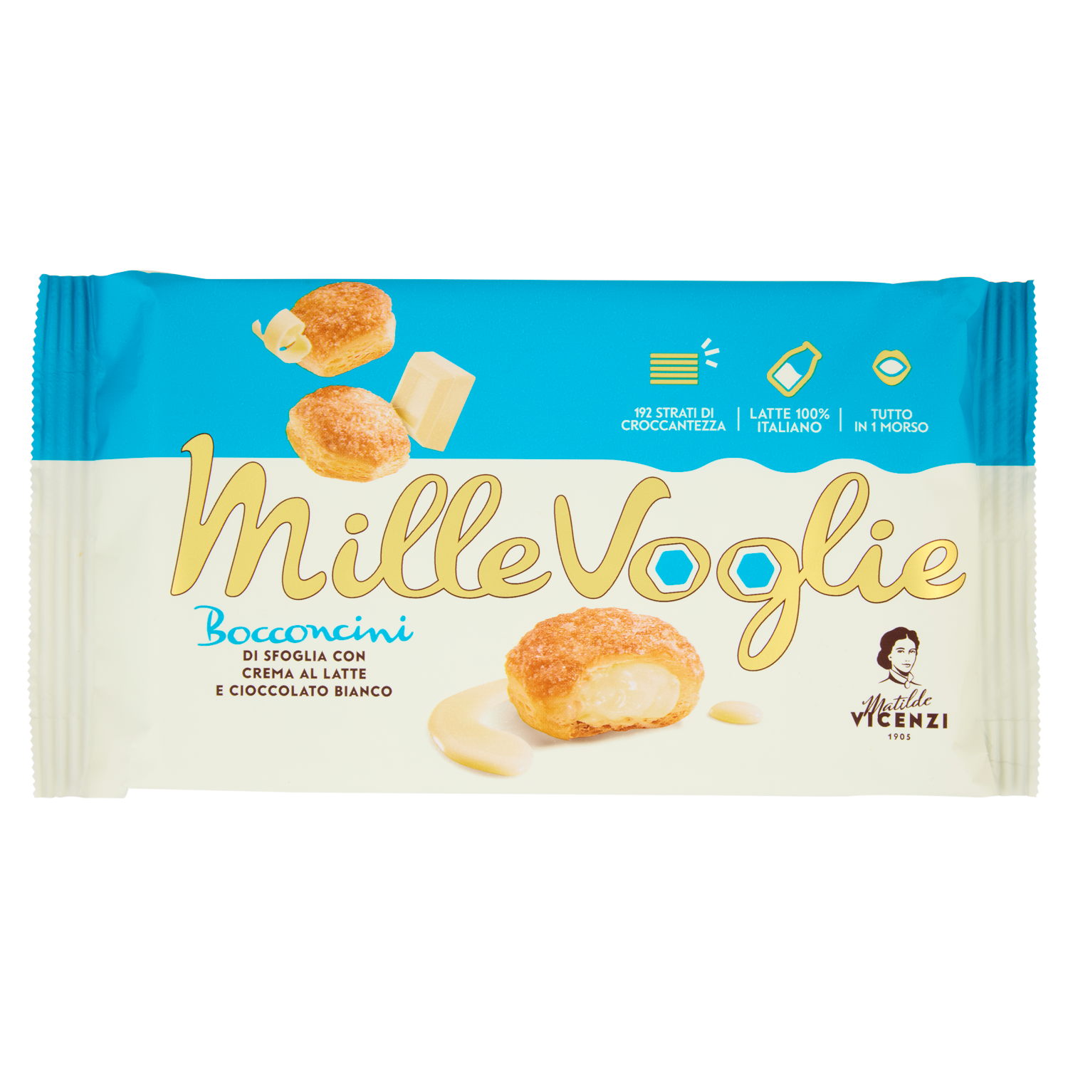 Origine Altro Testo: Snack di sfoglia ripiena con crema al latte 100% italiano e cioccolato bianco | Latte* *Prodotto con latte 100% Italiano