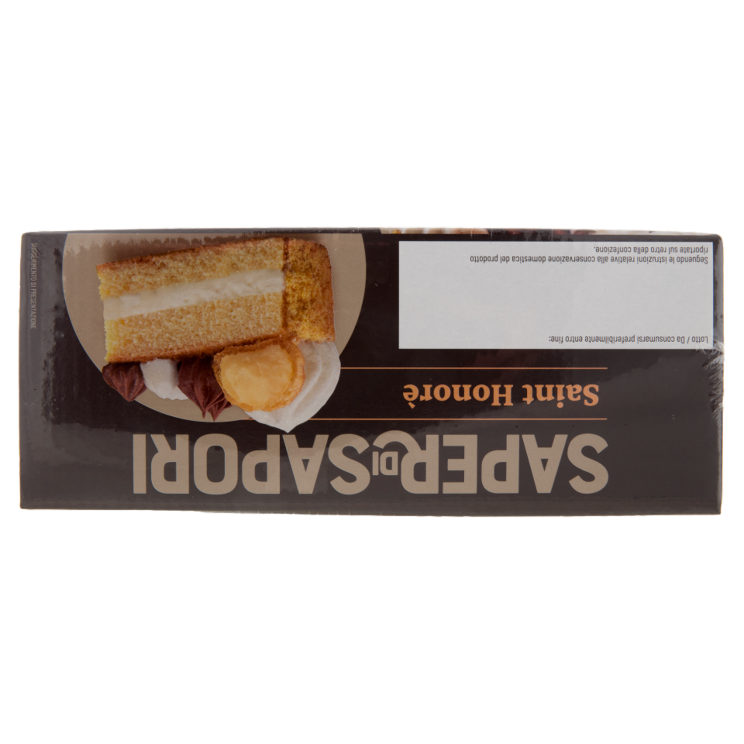 Torta Saint Honoré - Doppio strato di pan di spagna farcito con crema al latte (30%), decorato con ciuffi di crema cacao (7%), crema al latte (9%) e bignè ripieni di crema pasticcera (10%). Prodotto congelato