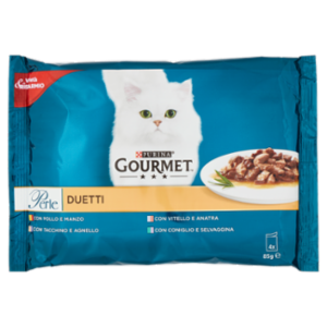 GOURMET Perle Duetti, semplici e raffinate creazioni per un'irresistibile esperienza di gusto ogni giorno. Senza l'aggiunta di coloranti. Senza conservanti e aromi artificiali aggiunti. Preparato con ingredienti di alta qualità. Progettata per essere riciclabile Questa bustina è progettata per essere riciclabile*. Il corretto smaltimento di questo cartoncino può variare in base al Paese. Verifica sul nostro sito. purina.eu/packaging - Varietà & Risparmio - Con pollo e manzo - Con vitello e anatra - Con tacchino e agnello - Con coniglio e selvaggina - 4x Buste 85g ℮