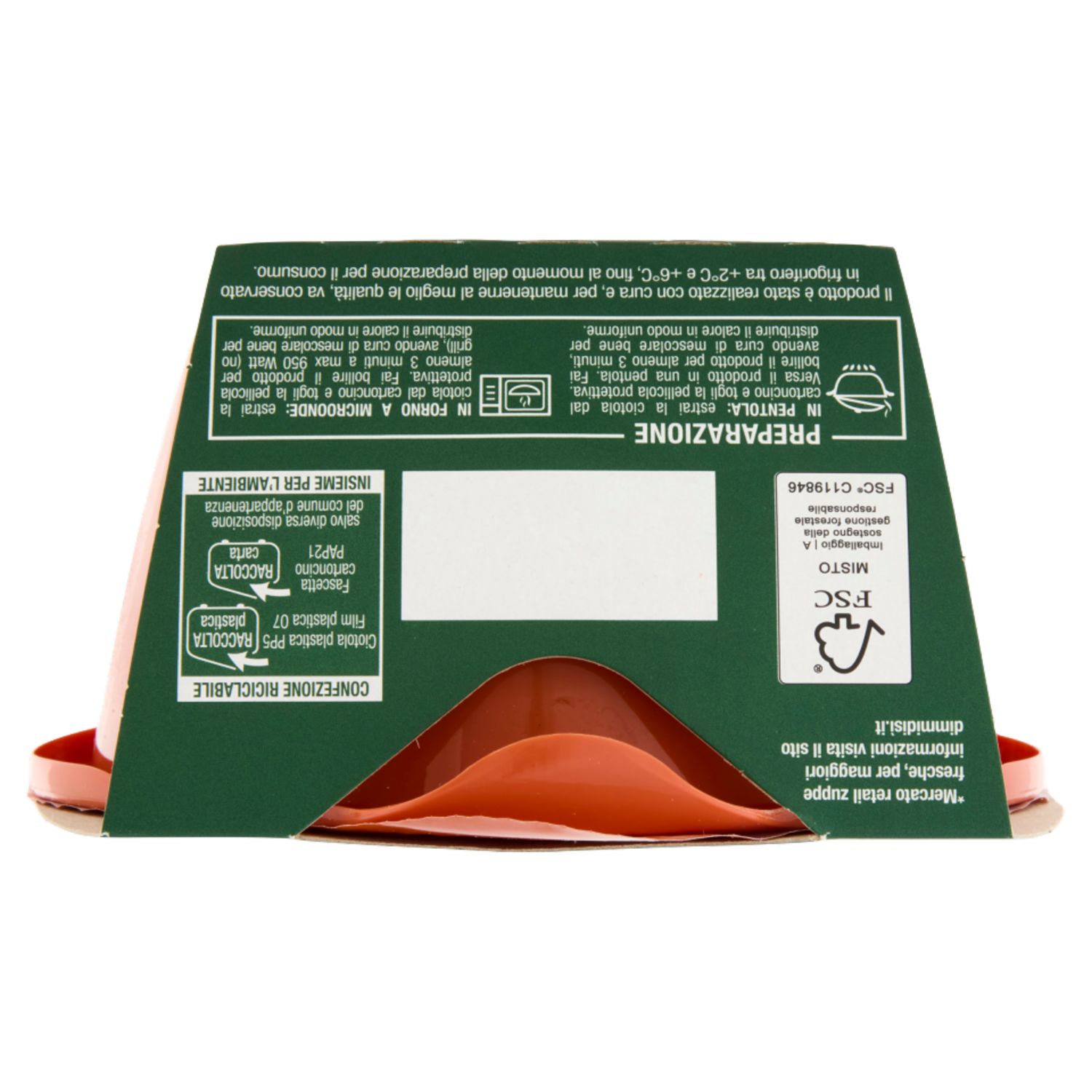 Preparazione In pentola: versa la zuppa in pentola e scalda a fuoco lento per alcuni minuti. In forno a microonde: fora la pellicola protettiva e scalda a massima potenza (no grill) per 3 minuti; quindi togli la pellicola protettiva: ecco la zuppa pronta da gustare! Se necessario puoi congelare la zuppa, purché la confezione sia integra, entro la data di scadenza. Una volta congelata è da consumare entro un mese.
