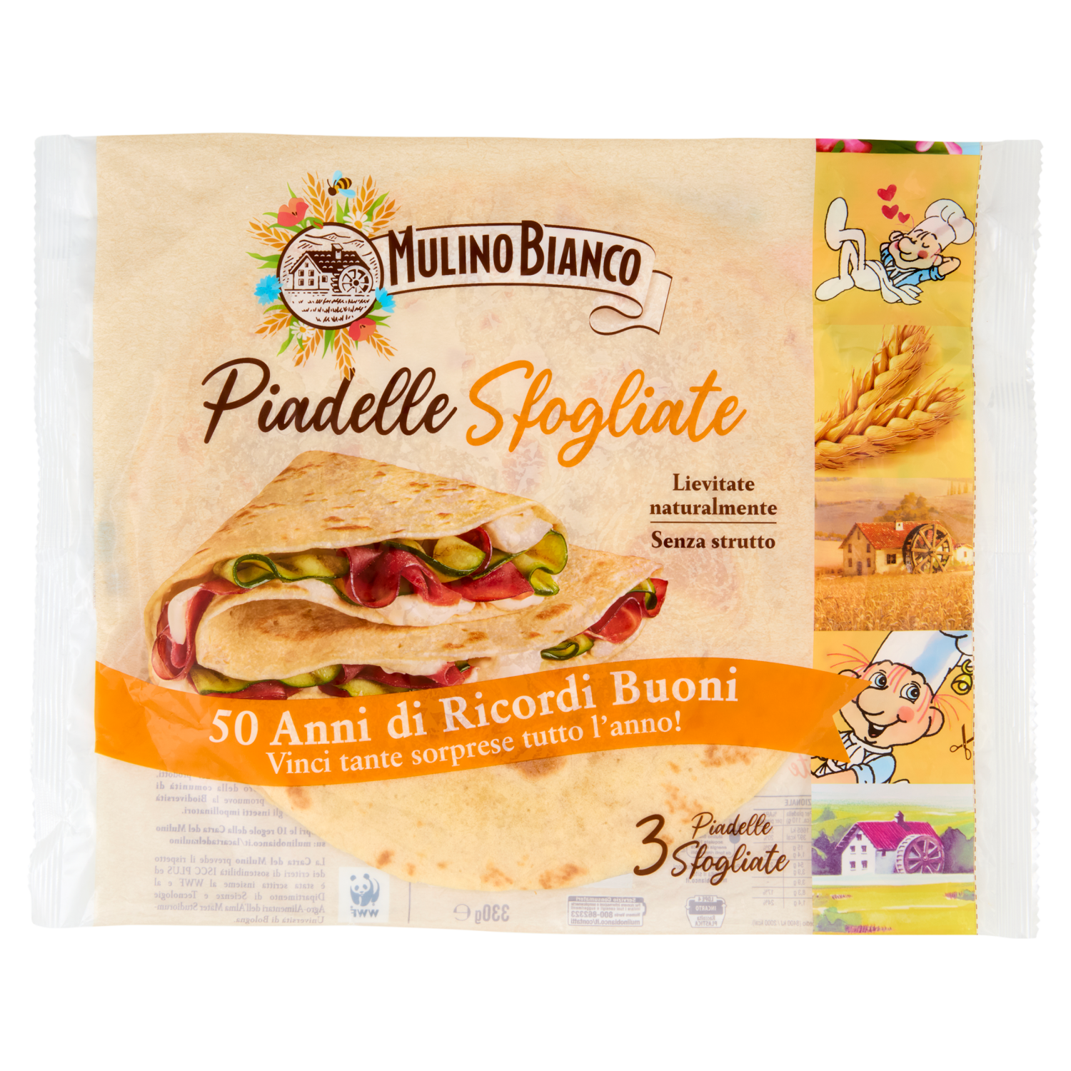 La Carta del Mulino Ogni Piadella di questa confezione è fatta con Farina di grano tenero da Agricoltura Sostenibile rispettando le 10 regole della Carta del Mulino. Con farina di grano tenero da agricoltura sostenibile La Carta del Mulino è il nostro disciplinare per la coltivazione sostenibile del grano tenero redatto insieme al WWF. Porta qualità nei prodotti, supporta il lavoro della comunità di Agricoltori e promuove la Biodiversità favorendo gli insetti impollinatori. Scopri le 10 regole della Carta del Mulino su: mulinobianco.it/lacartadelmulino La Carta del Mulino prevede il rispetto dei criteri di sostenibilità ISCC Plus ed è stata scritta insieme al WWF e al Dipartimento di Scienze e Tecnologie Agro-Alimentari dell'Alma Mater Studiorum-Università di Bologna. Il buono che non vedi - Acquistiamo il 100% energia elettrica da fonti rinnovabili. - I nostri prodotti sono senza grassi idrogenati. mulinobianco.it Tutto il buono che puoi creare Ideali da farcire in tanti modi diversi, le Piadelle Sfogliate sono perfette per un pranzo veloce e gustoso o una cena in compagnia. Gustale così! Zucchine grigliate Robiola saporita e cremosa Suggerimento: puoi aggiungere erba cipollina e noci da amalgamare nel formaggio Bresaola della Valtellina