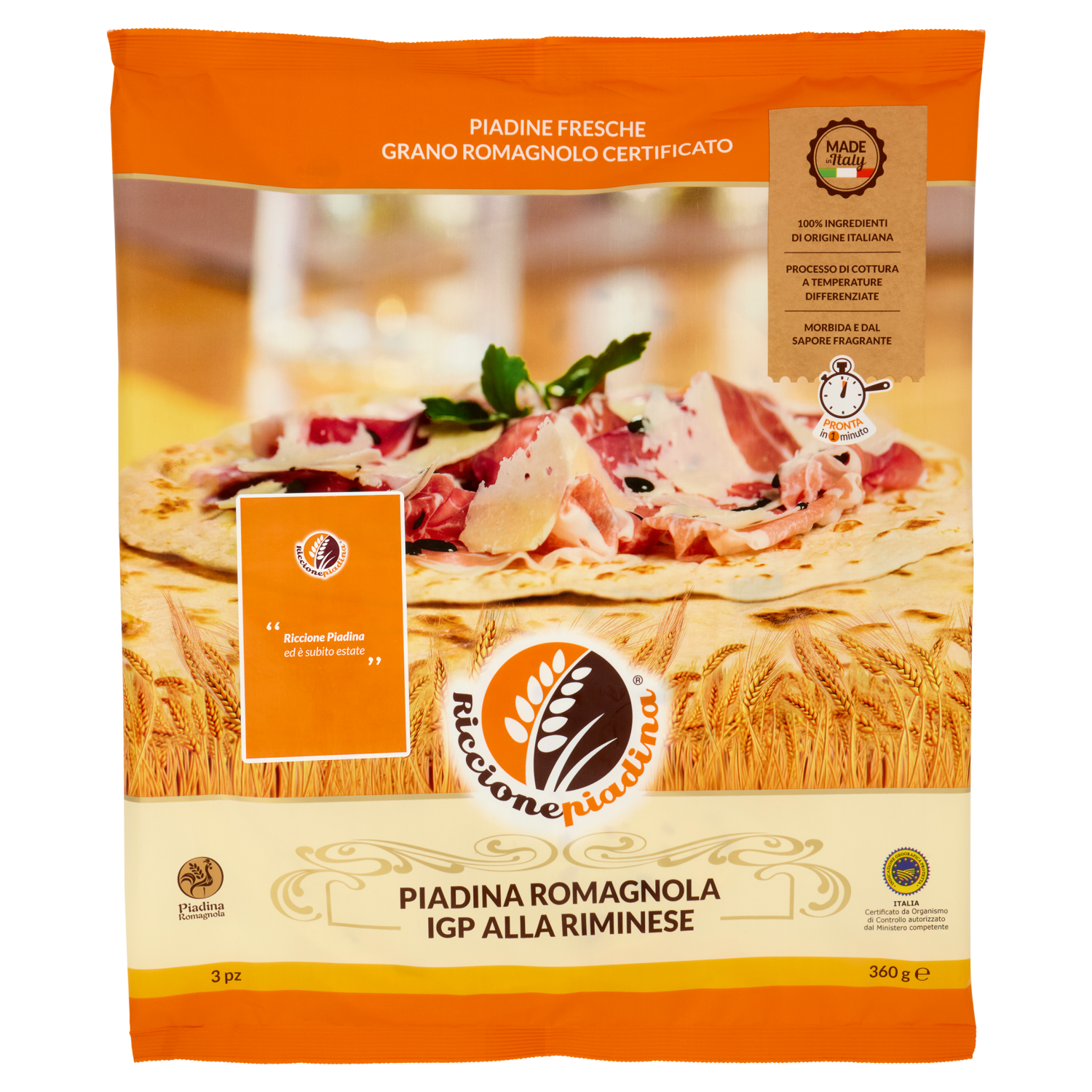 Grano Romagnolo Certificato La nostra Piadina è realizzata solo con farina ottenuta da grano tenero coltivato in Romagna con certificato del sistema di rintracciabilità di filiera. 100% ingredienti italiani - Farina di grano tenero coltivato in Romagna - Acqua proveniente dalle fonti idriche locali - Strutto di suini allevati in Italia - Sale e agenti lievitanti di origine italiana