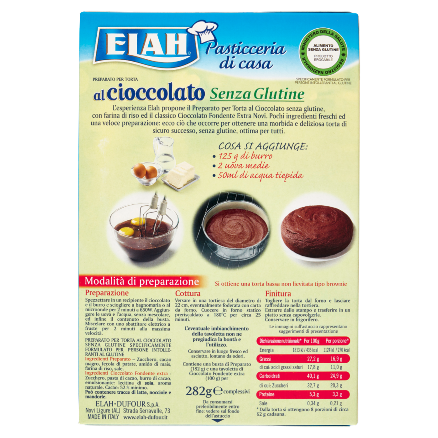 Preparato per Torta al cioccolato Senza Glutine L'esperienza Elah propone il Preparato per Torta al Cioccolato senza glutine, con farina di riso ed il classico Cioccolato Fondente Extra Novi. Pochi ingredienti freschi ed una veloce preparazione: ecco ciò che occorre per ottenere una morbida e deliziosa torta di sicuro successo, senza glutine, ottima per tutti.