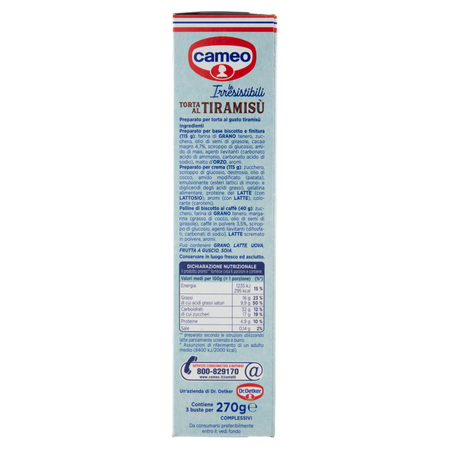 Dentro trovi: 115g di preparato per crema al gusto tiramisù, 115g di preparato per base biscotto e finitura, 40g di palline al caffè, 1 stampo per torte Aggiungi: 75g di burro, 300ml di latte freddo di frigorifero Prepara la base biscotto Monta lo stampo seguendo le istruzioni e trasferiscilo su un piatto. Sciogli il burro nel pentolino a fiamma moderata, toglilo dal fuoco, aggiungi il preparato per base biscotto e amalgama bene il tutto. Tieni da parte 1/3 del composto per finitura e distribuisci i restanti 2/3 sulla base dello stampo premendo bene con un cucchiaio, in modo da mantenere un fondo uniforme e compatto. Poni in frigorifero per 10 minuti Prepara la crema Versa 300 ml di latte freddo di frigorifero in una terrina a sponde alte, aggiungi il preparato per crema, mescola con lo sbattitore elettrico a bassa velocità, quindi monta per 4 minuti alla massima velocità. Incorpora delicatamente le palline alla crema, distribuisci sulla base biscotto e livella con un cucchiaio. Tempo di sbattitura per la crema 4 minuti Il tocco finale Decora la superficie con il composto tenuto da parte e metti in frigorifero per almeno 3 ore. Prima di servire, stacca l'anello con l'aiuto di un coltello bagnato. Consuma la torta fredda di frigorifero. Tempo in frigorifero 3 ore Conserva la torta pronta per il consumo in frigorifero e consumala entro 2 giorni.