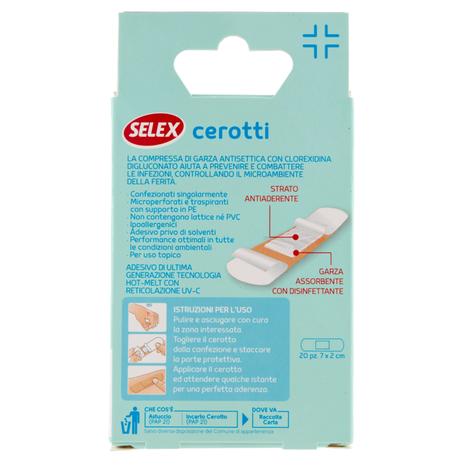 Istruzioni per l'uso Pulire e asciugare con cura la zona interessata. Togliere il cerotto dalla confezione e staccare la parte protettiva. Applicare il cerotto ed attendere qualche istante per una perfetta aderenza.