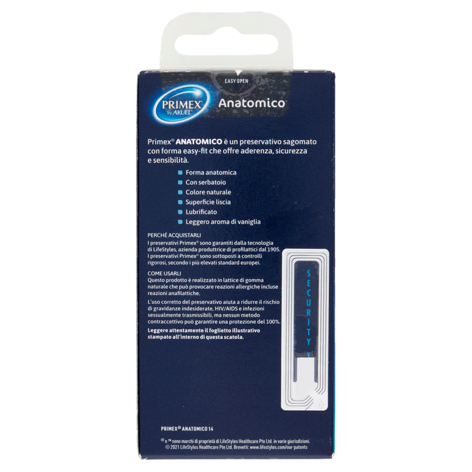 Primex Anatomico è un preservativo sagomato con forma easy-fit che offre aderenza, sicurezza e sensibilità. - Forma anatomica - Con serbatoio - Colore naturale - Superficie liscia - Lubrificato - Leggero aroma di vaniglia Odore discreto e piacevole Anatomico Superficie liscia