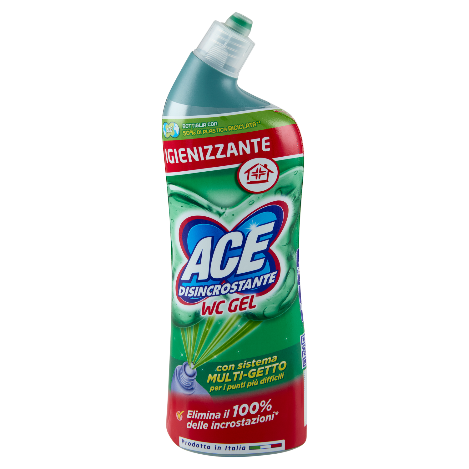 Elimina il 100% delle incrostazioni* Da oggi Ace WC Gel elimina il 99.99% di germi e batteri, disinfettando il WC. Grazie all'innovativo sistema con 6 getti, Ace WC Gel arriva anche nei punti più difficili da raggiungere garantendo una copertura uniforme e completa del WC. *le più comuni incrostazioni, con l'uso regolare del prodotto Ace rispetta l'ambiente: - Ecobottiglie con plastica riciclata - 100% Riciclabili - Formula senza micro plastiche