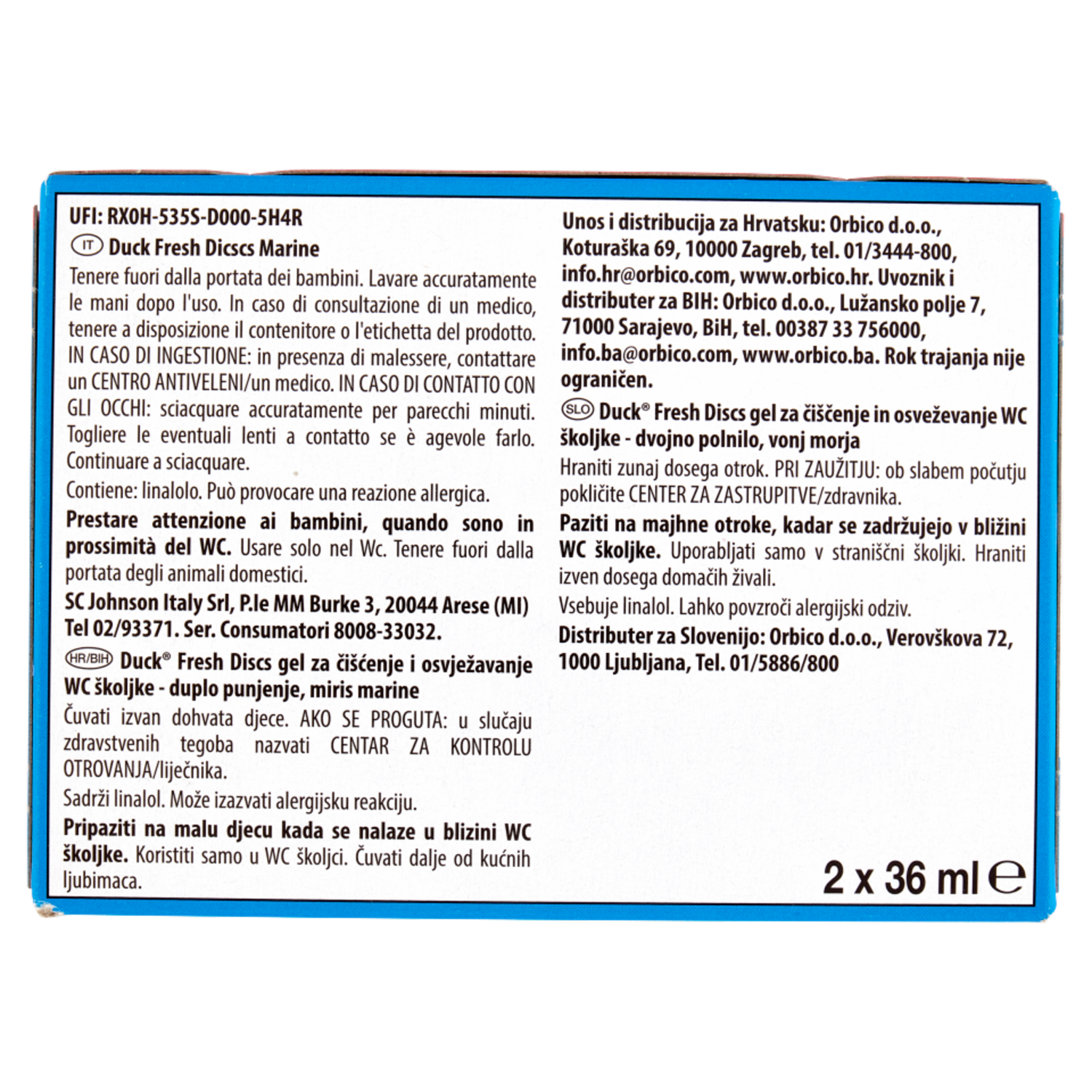 UFI: RX0H-535S-D000-5H4R Duck Fresh Dicscs Marine Tenere fuori dalla portata dei bambini. Lavare accuratamente le mani dopo l'uso. In caso di consultazione di un medico, tenere a disposizione il contenitore o l'etichetta del prodotto. IN CASO DI INGESTIONE: in presenza di malessere, contattare un CENTRO ANTIVELENI/un medico. IN CASO DI CONTATTO CON GLI OCCHI: sciacquare accuratamente per parecchi minuti. Togliere le eventuali lenti a contatto se è agevole farlo. Continuare a sciacquare. Contiene: linalolo. Può provocare una reazione allergica. Prestare attenzione ai bambini, quando sono in prossimità del WC. Usare solo nel Wc. Tenere fuori dalla portata degli animali domestici.