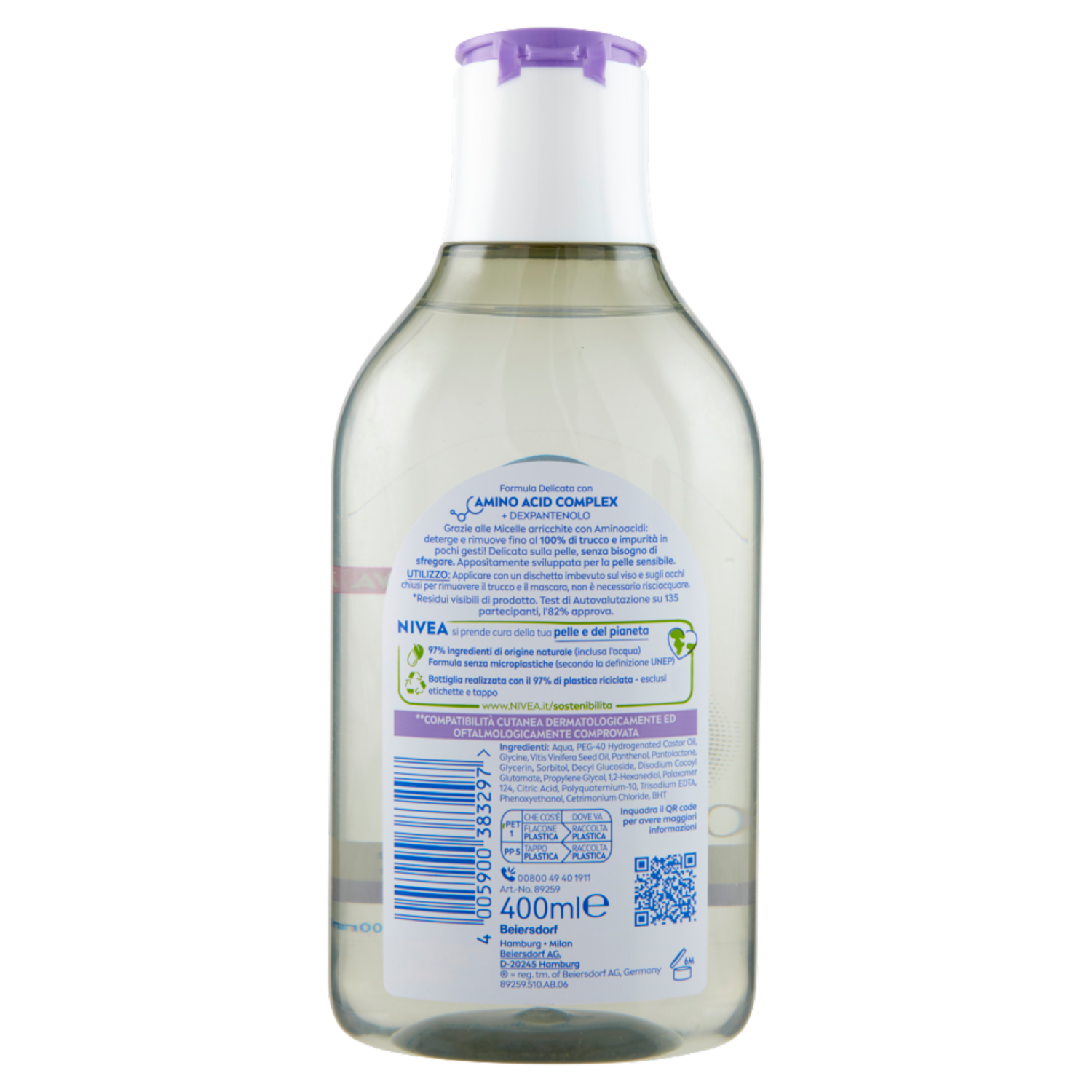 Formula Delicata con Amino Acid Complex + Dexpantenolo Grazie alle Micelle arricchite con Aminoacidi: deterge e rimuove fino al 100% di trucco e impurità in pochi gesti! Delicata sulla pelle, senza bisogno di sfregare. Appositamente sviluppata per la pelle sensibile. Nivea si prende cura della tua pelle e del pianeta - 97% ingredienti di origine naturale (inclusa l'acqua) Formula senza microplastiche (secondo la definizione UNEP) - Bottiglia realizzata con il 97% di plastica riciclata - esclusi etichette e tappo www.nivea.it/sostenibilita