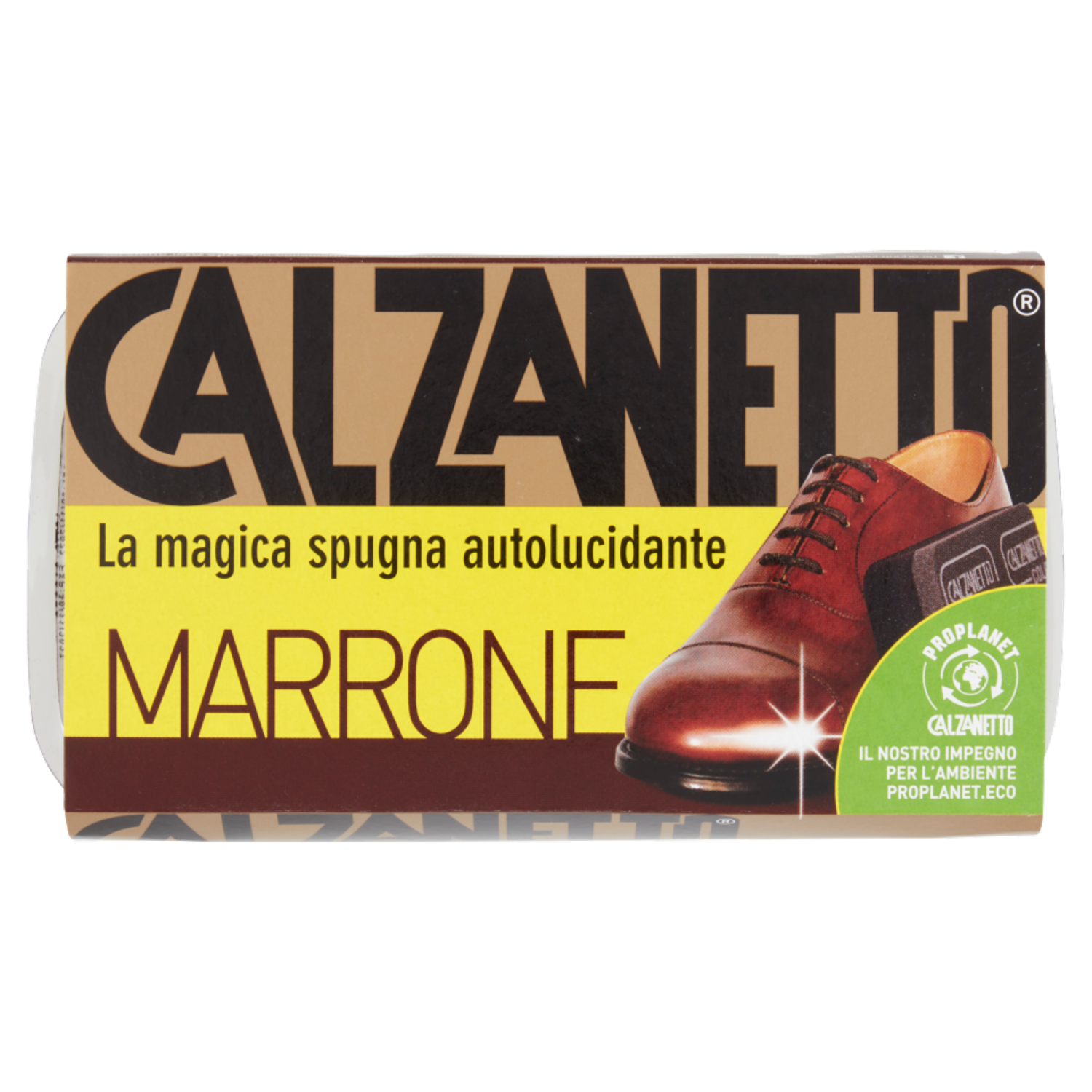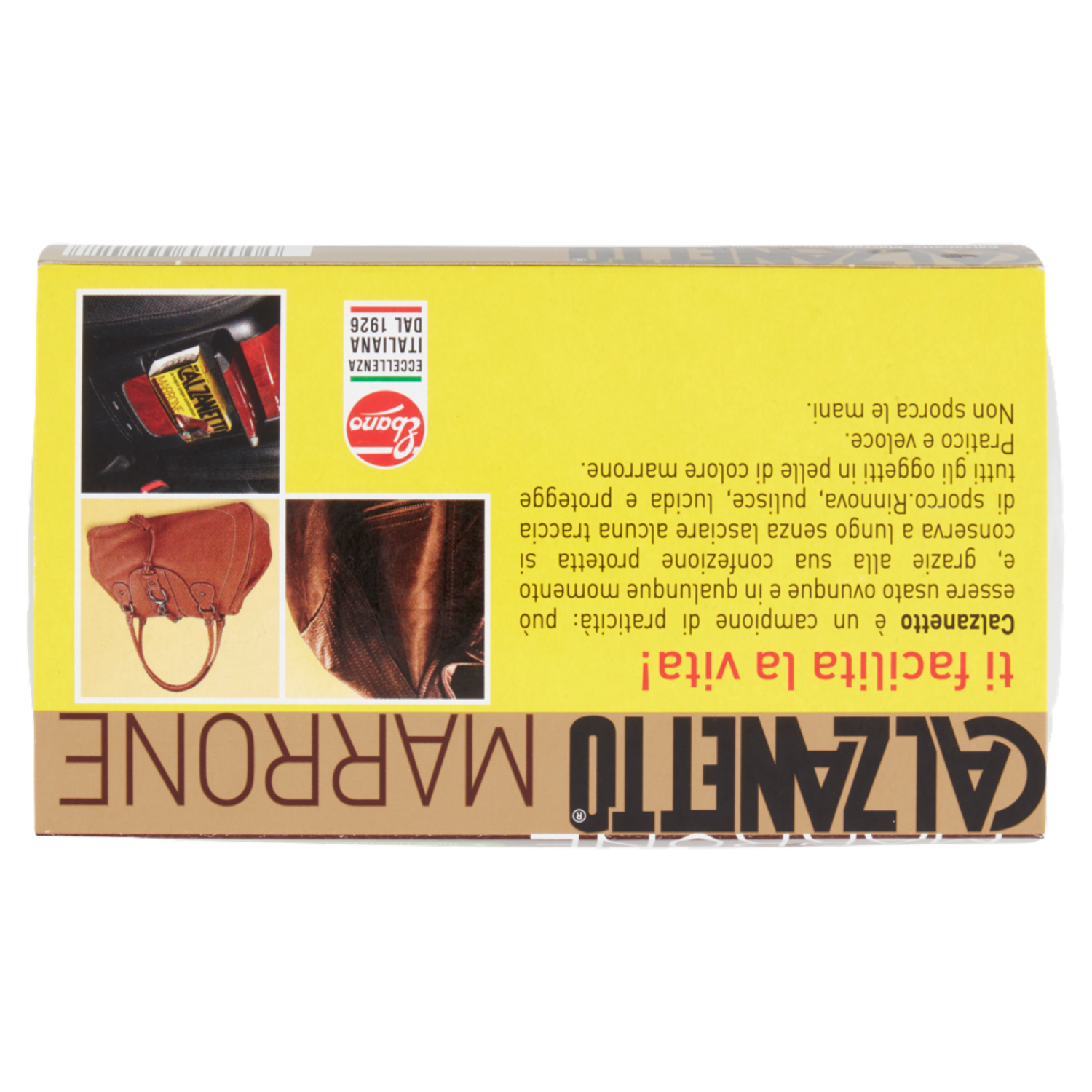 ti facilita la vita! Calzanetto è un campione di praticità: può essere usato ovunque e in qualunque momento e, grazie alla sua confezione protetta si conserva a lungo senza lasciare alcuna traccia di sporco. Rinnova, pulisce, lucida e protegge tutti gli oggetti in pelle di colore marrone. Pratico e veloce. Non sporca le mani. Calzanetto Marrone: Grazie agli oli di silicone ad alta densità, rinnova e garantisce un velo di lucentezza uniforme e duratura sulle pelli di colore marrone, in un solo gesto. Non Usare: su cuoio, vacchetta e pelli ingrassate su cui è indicato l'uso di Calzanetto Cuoio e Pelli Ingrassate; su nabuk, crosta e pelli scamosciate su cui è indicato l'uso di Calzanetto Camoscio. Non usare inoltre su nappa, pelli non trattate e a pori aperti. Disponibile anche nella versione Neutro per pelli di qualunque colore e nella versione leggermente tingente Nero. La magica spugna autolucidante imbevuta di raffinati oli di silicone ad alta densità. - Astuccio in carta 100% riciclata - Vaschetta in PET 80% riciclato