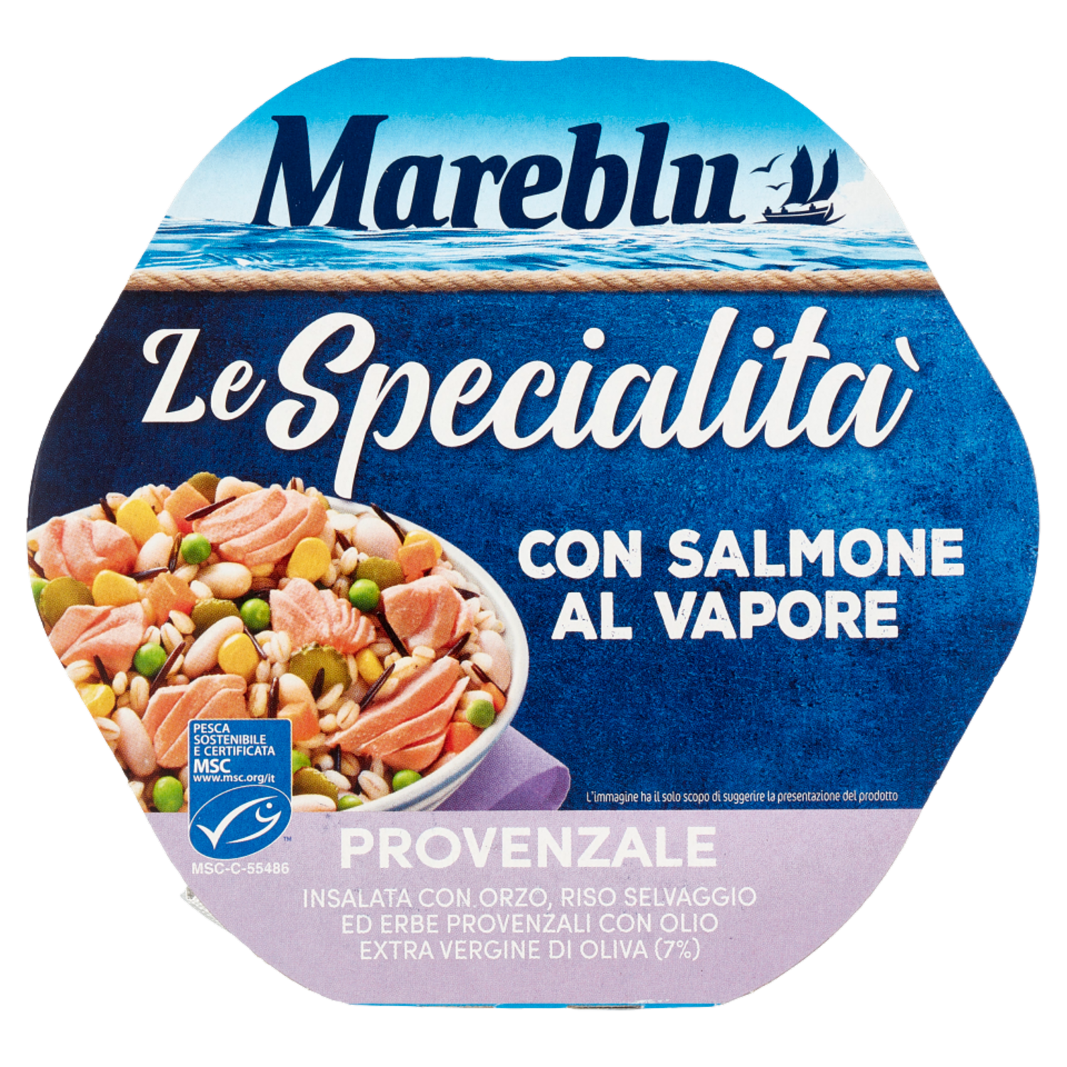 Provenzale - Per un Piatto unico Bilanciato* Insalata con salmone rosa selvaggio, orzo, riso selvaggio ed erbe provenzali con olio extravergine di oliva (7%). Per un piatto unico bilanciato aggiungi alla tua insalata Mareblu della verdura di stagione condita con un filo d'olio extravergine di oliva e una porzione di pane e di frutta. *in riferimento alla ripartizione di macronutrienti prevista dai LARN (Livelli di Assunzione di Riferimento di Nutrienti ed energia per la popolazione italiana) su base giornaliera.