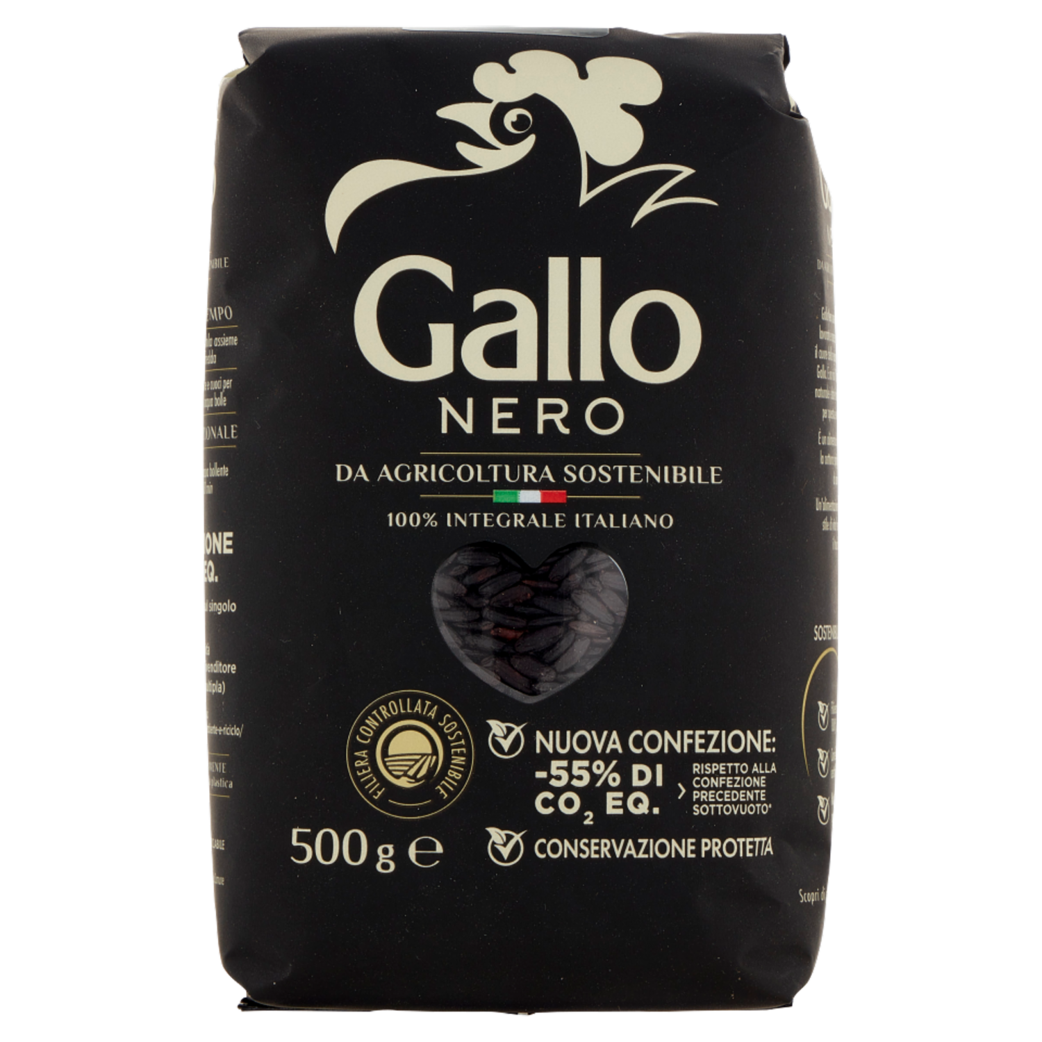 Naturalmente fonte di fibre Gallo Nero nasce e cresce in Italia e viene lavorato e confezionato a Robbio Lomellina, il cuore della regione del riso, dove ha sede Riso Gallo. È un riso 100% integrale e il colore nero naturale è dato dal rivestimento dei suoi chicchi, per questo è naturalmente fonte di fibre. È un alimento buono e versatile, che durante la cottura sprigiona un caratteristico aroma di pane appena sfornato Un'alimentazione sana e completa e un corretto stile di vita favoriscono quotidianamente il tuo benessere generale.