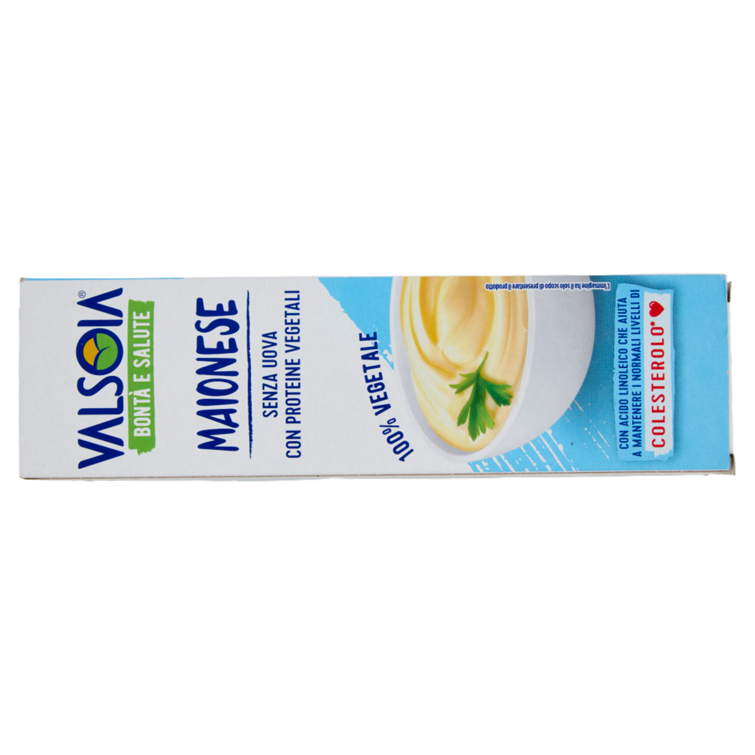 *Nell'ambito di una dieta varia ed equilibrata e di uno stile di vita sano, l'assunzione di 10g di acido linoleico al giorno contribuisce al mantenimento dei normali livelli di colesterolo nel sangue. Una porzione di "Maionese Valsoia" pari a 12g fornisce circa il 44% della quantità giornaliera da assumere per avere l'effetto benefico. Questa confezione contiene circa 12 porzioni