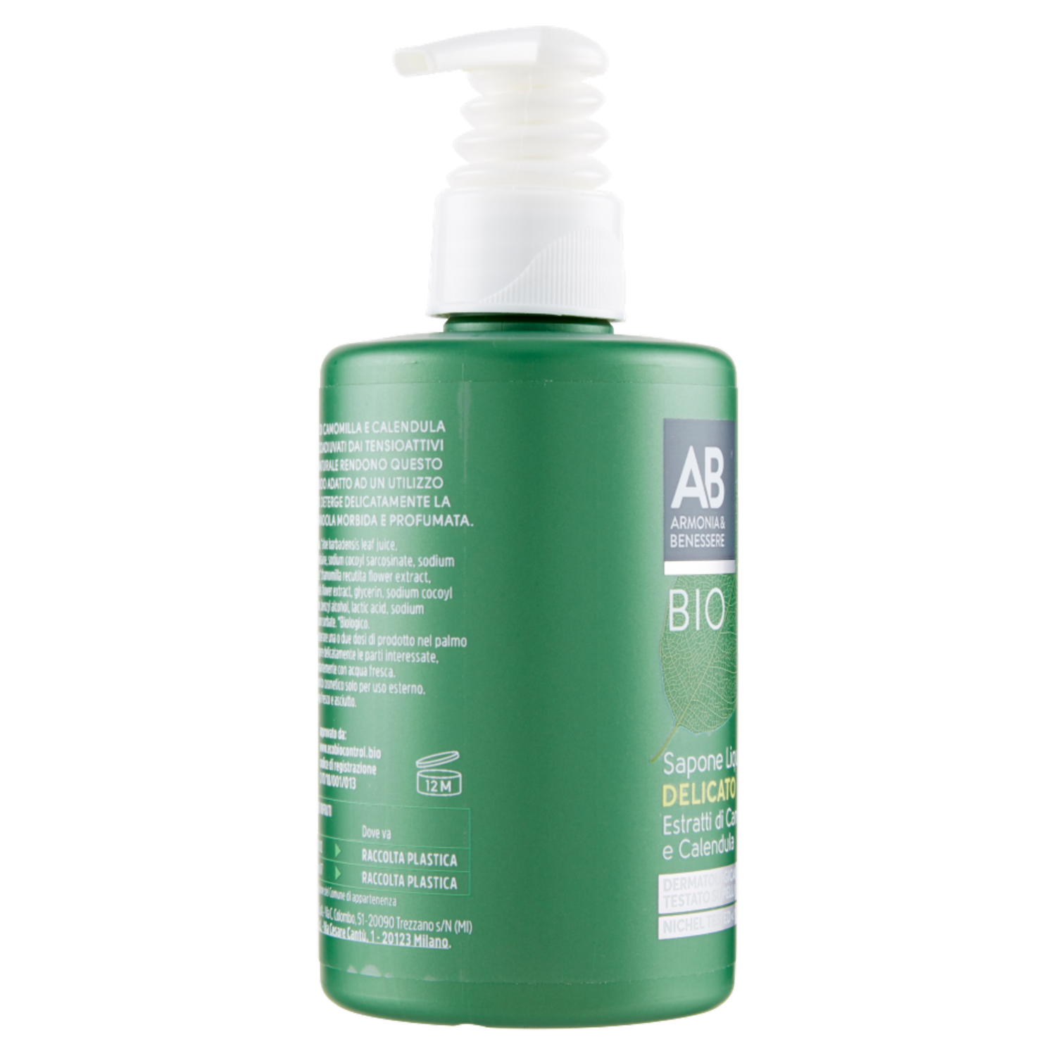 Gli estratti di camomilla e calendula biologici, coadiuvati dai tensioattivi di origine naturale rendono questo sapone liquido adatto ad un utilizzo quotidiano. Deterge delicatamente la pelle, lasciandola morbida e profumata.