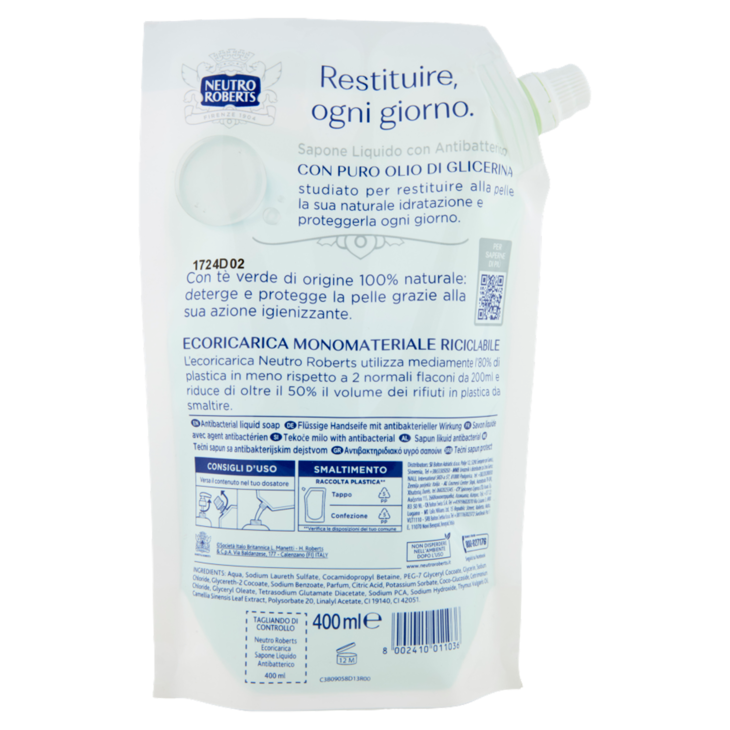 tè verde di origine 100% naturale Gentile con la pelle Neutro Roberts Sapone Liquido con Antibatterico con Tè Verde 100% di origine naturale: protegge la tua pelle con la sua azione igienizzante. -50% Rifiuti -80% Plastica Gentile con il pianeta Ecoricarica monomateriale completamente riciclabile L'ecoricarica Neutro Roberts utilizza mediamente il 80% di plastica in meno rispetto a 2 normali flaconi con pompetta da 200ml e riduce di oltre il 50% il volume dei rifiuti in plastica da smaltire.