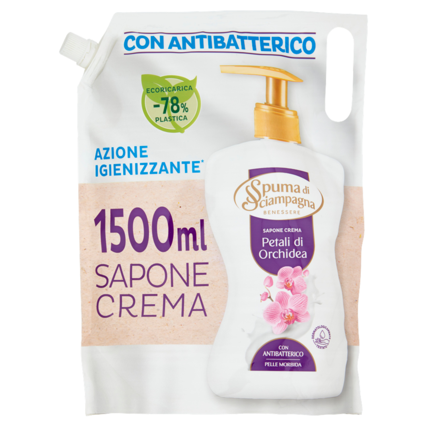 100% Prodotto italiano More - Note di testa Gelsomino e petali di orchidea - Note di cuore Legno di sandalo - Note di fondo Il mix delle note olfattive è stato studiato per richiamare il profumo dei Petali di Orchidea. Formula cremosa Con antibatterico di origine naturale Ideale per tutta la famiglia pH neutro per la pelle Lasciati avvolgere da un abbraccio profumato! Prova anche i Bagnodoccia Crema Spuma di Sciampagna 360 Tonnellate La plastica risparmiata ogni anno grazie alle ecoricariche Saponi Liquidi Spuma di Sciampagna Ecoricarica -78% plastica Questa confezione utilizza il 78% di plastica in meno rispetto a 3 flaconi da 500 ml di sapone liquido e aiuta a ridurre il volume dei rifiuti.