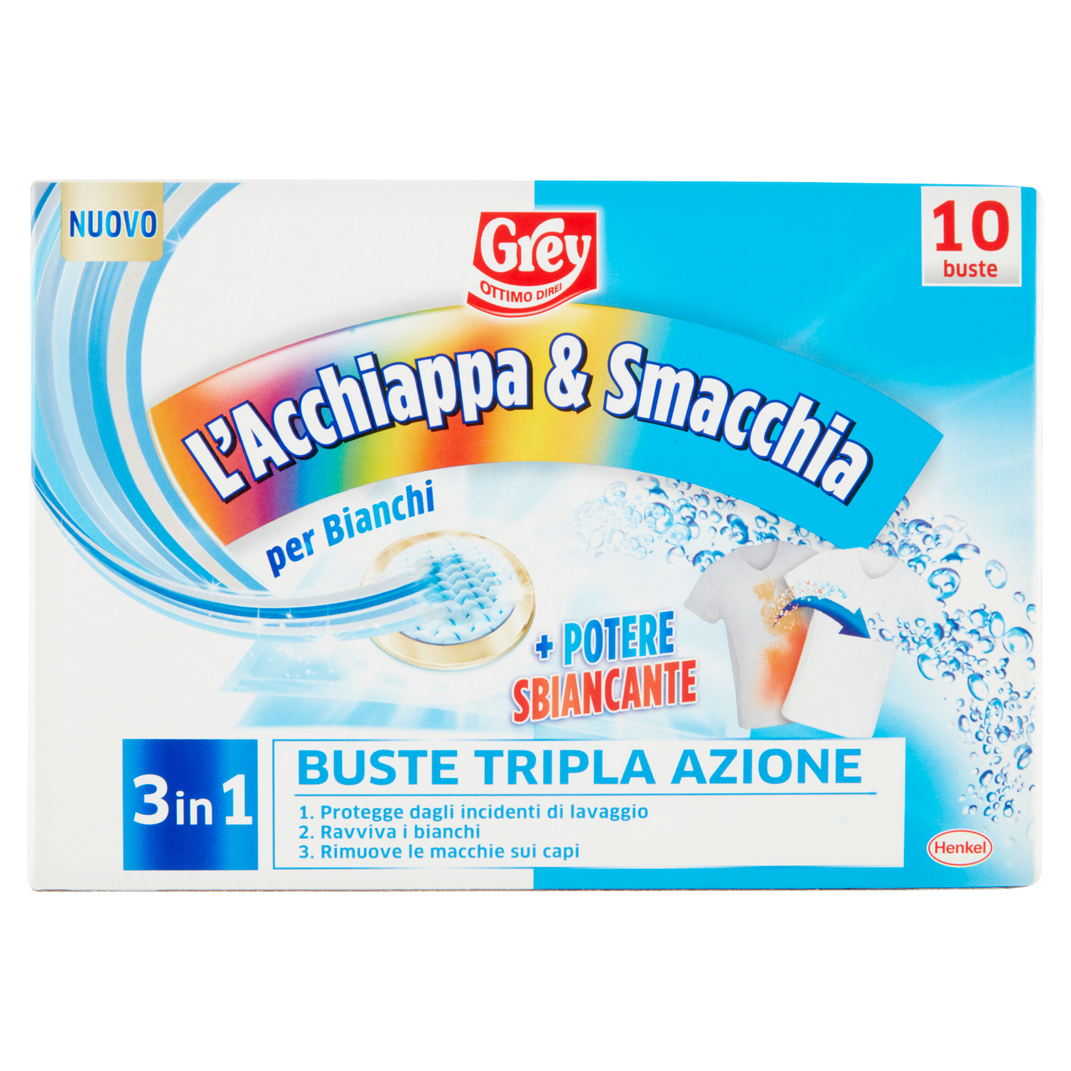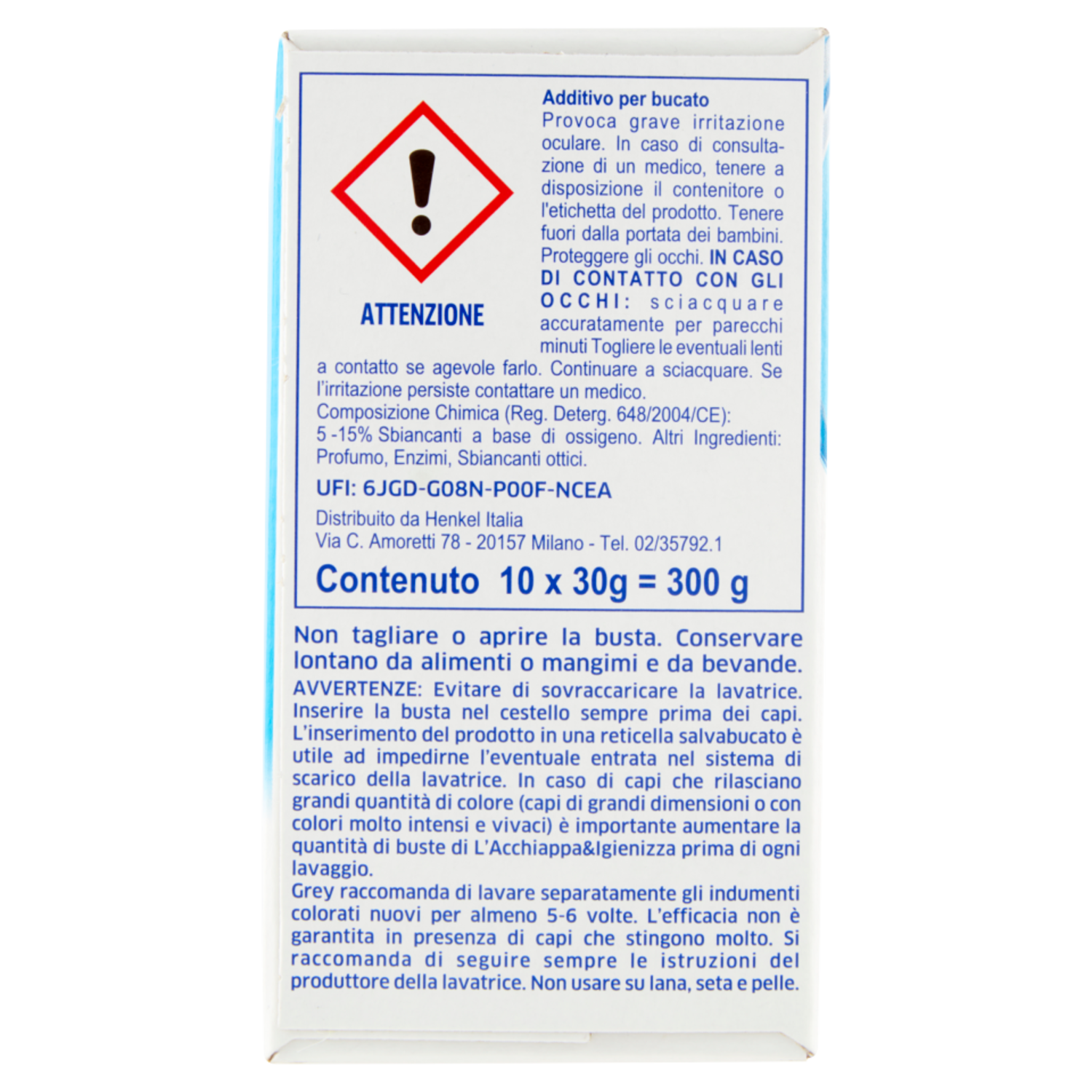 ATTENZIONE Additivo per bucato Provoca grave irritazione oculare. In caso di consultazione di un medico, tenere a disposizione il contenitore o l'etichetta del prodotto. Tenere fuori dalla portata dei bambini. Proteggere gli occhi. IN CASO DI CONTATTO CON GLI OCCHI: sciacquare accuratamente per parecchi minuti Togliere le eventuali lenti a contatto se agevole farlo. Continuare a sciacquare. Se l'irritazione persiste contattare un medico. UFI: 6JGD-G08N-P00F-NCEA Non tagliare o aprire la busta. Conservare lontano da alimenti o mangimi e da bevande. AVVERTENZE: Evitare di sovraccaricare la lavatrice. Inserire la busta nel cestello sempre prima dei capi. L'inserimento del prodotto in una reticella salvabucato è utile ad impedirne l'eventuale entrata nel sistema di scarico della lavatrice. In caso di capi che rilasciano grandi quantità di colore (capi di grandi dimensioni o con colori molto intensi e vivaci) è importante aumentare la quantità di buste di L'Acchiappa&Igienizza prima di ogni lavaggio. Grey raccomanda di lavare separatamente gli indumenti colorati nuovi per almeno 5-6 volte. L'efficacia non è garantita in presenza di capi che stingono molto. Si raccomanda di seguire sempre le istruzioni del produttore della lavatrice. Non usare su lana, seta e pelle. A.I.S.E.