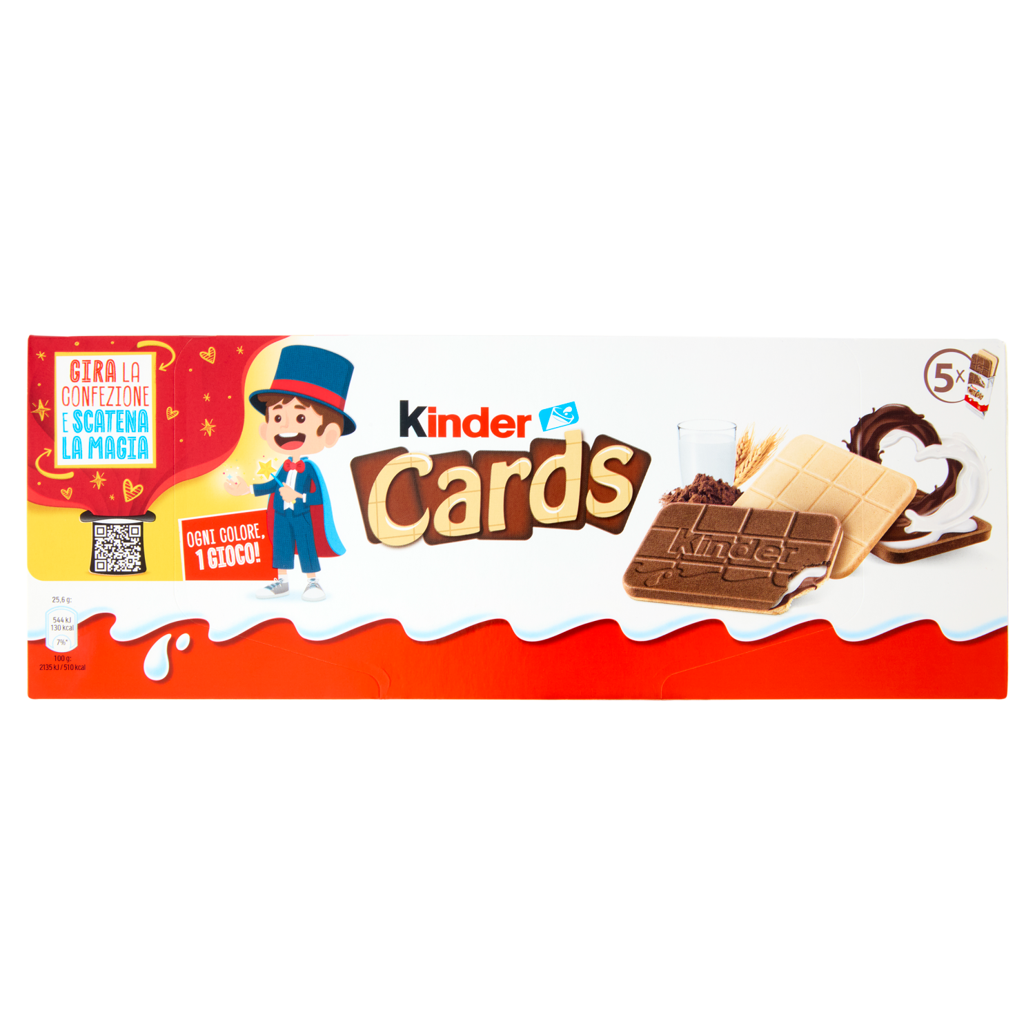 Kinder Cards Il Biscotto Kinder Così Sottile, Così Sorprendentemente Cremoso - 100% Kinder Due cialde sottilissime e croccanti racchiudono un cuore cremoso inconfondibilmente Kinder, ricco di latte e con cacao - 2 Kinder Cards 25,6g Una piccola porzione pensata per una buona merenda, pratica tutto l'anno anche fuori casa - Senza coloranti e conservanti Ingredienti rigorosamente selezionati per garantire la massima qualità Kinder