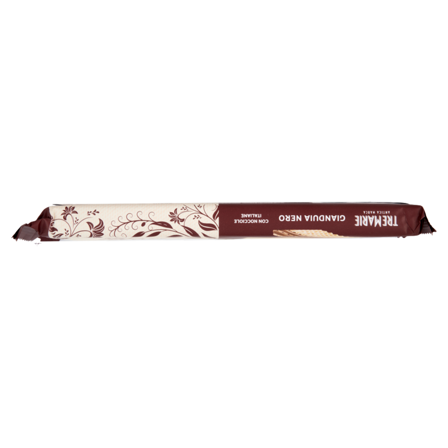 Gianduia nero Con nocciole italiane Cialde croccanti abbracciano una crema vellutata al gusto intenso e deciso del cioccolato gianduia nero.