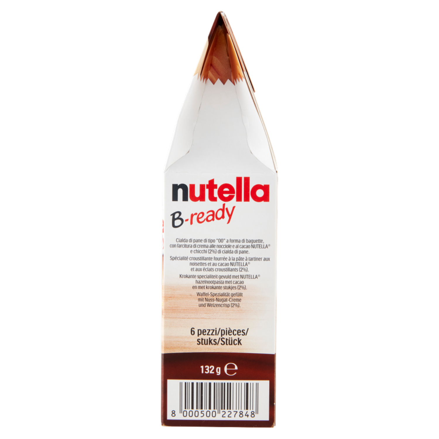 Cialda di pane di tipo "00" a forma di baguette, con farcitura di crema alle nocciole e al cacao Nutella e chicchi (2%) di cialda di pane