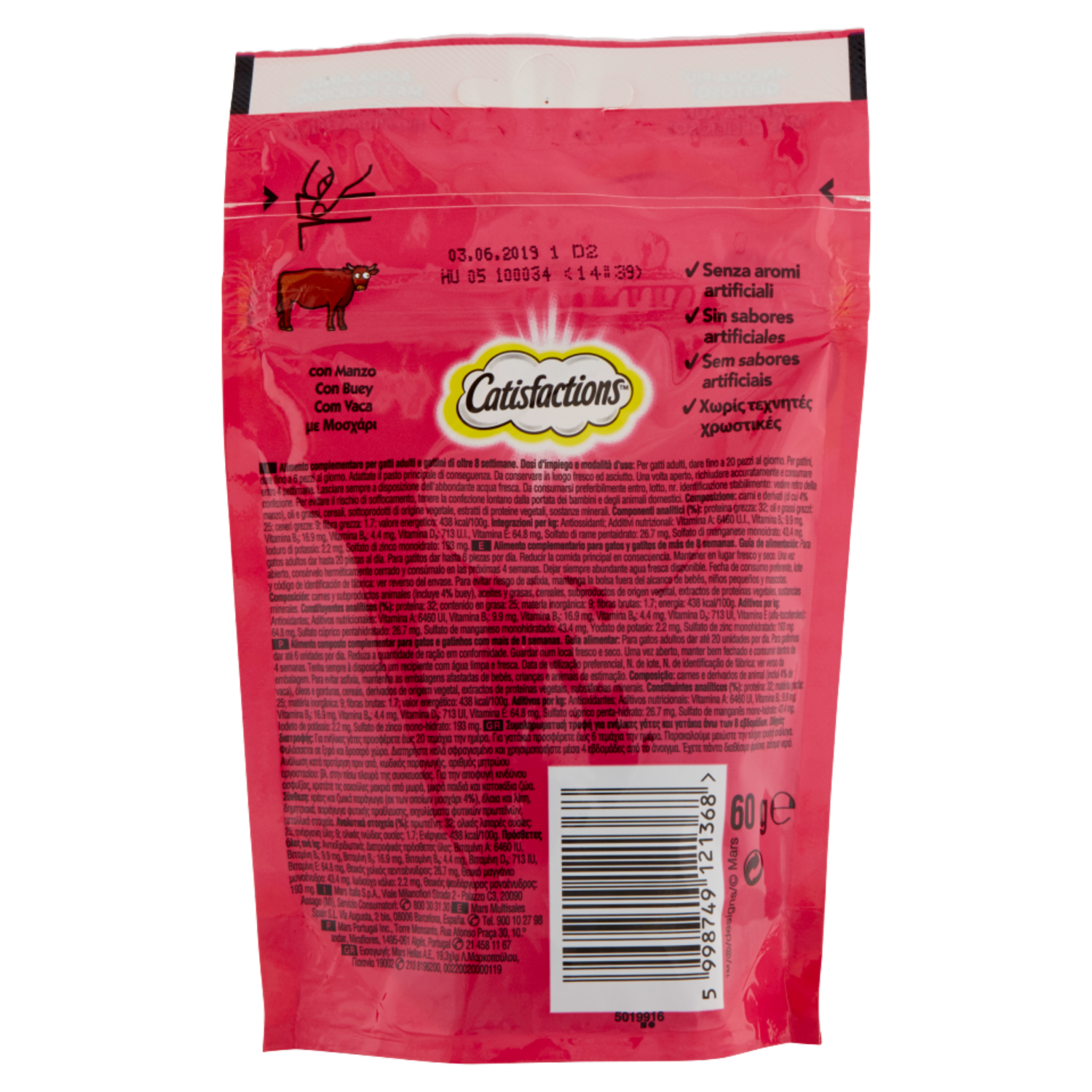 Dosi d'impiego e modalità d'uso: Per gatti adulti, dare fino a 20 pezzi al giorno. Per gattini, dare fino a 6 pezzi al giorno. Adattate il pasto principale di conseguenza. Da conservare in luogo fresco ed asciutto. Una volta aperto, richiudere accuratamente e consumare entro 4 settimane. Lasciare sempre a disposizione dell'abbondante acqua fresca. Solo per uso interno
