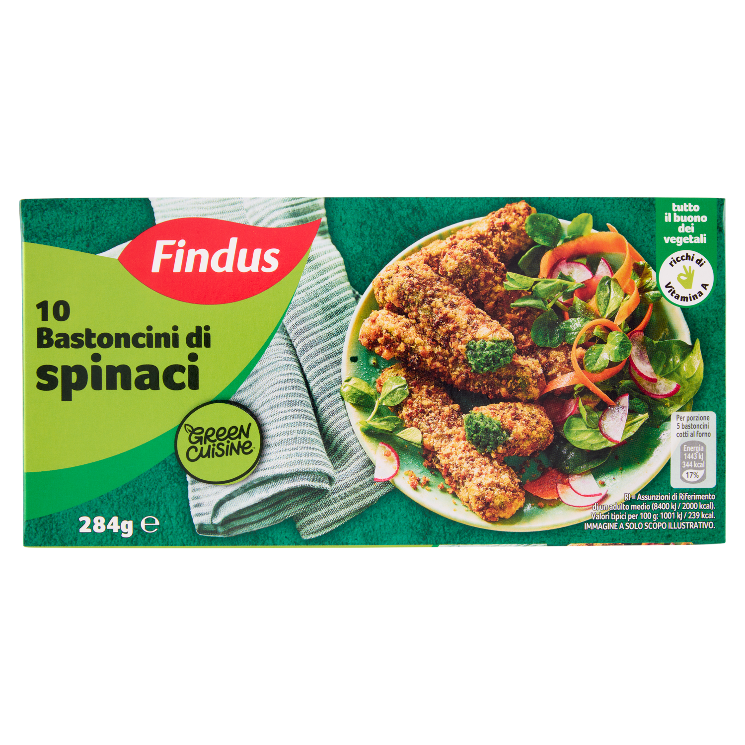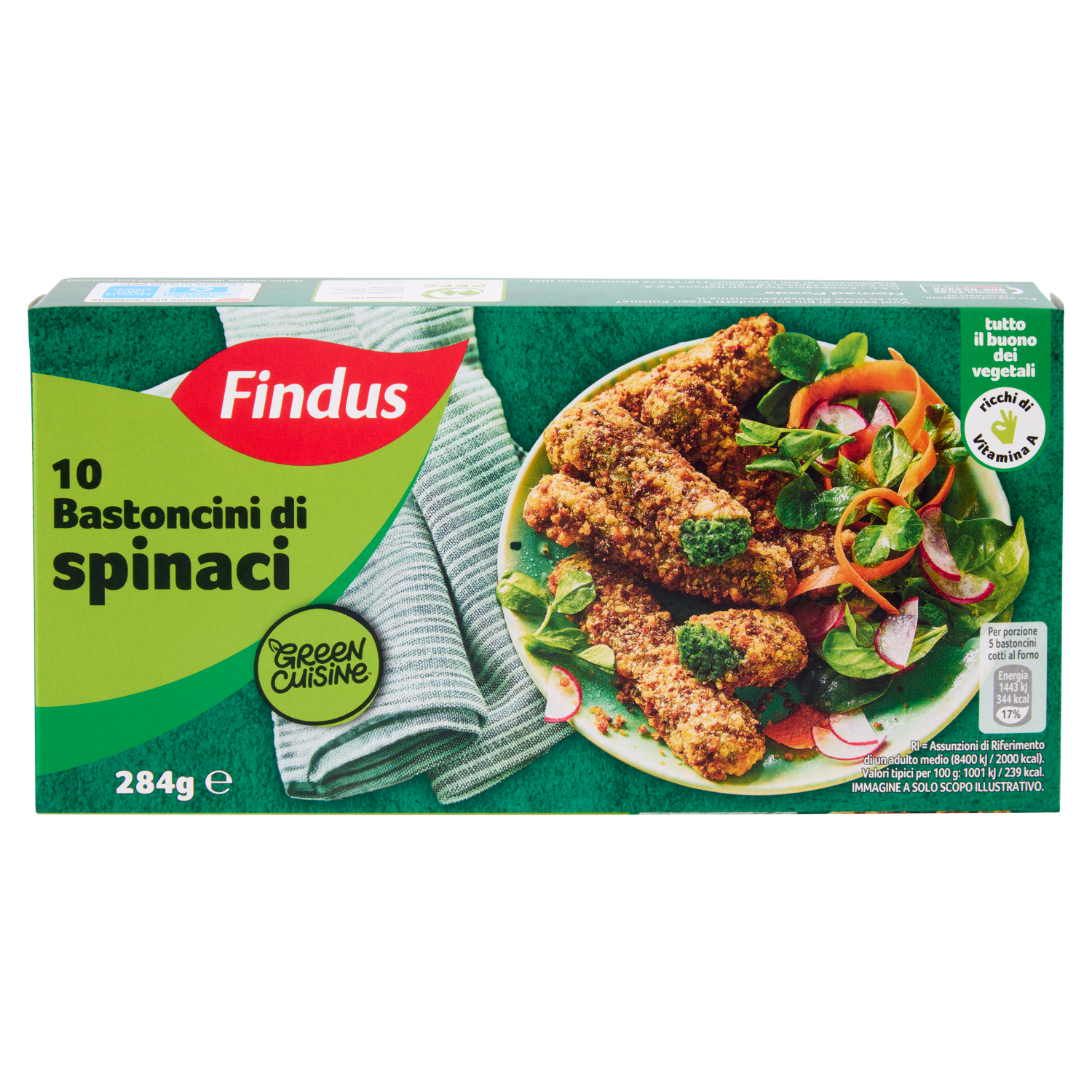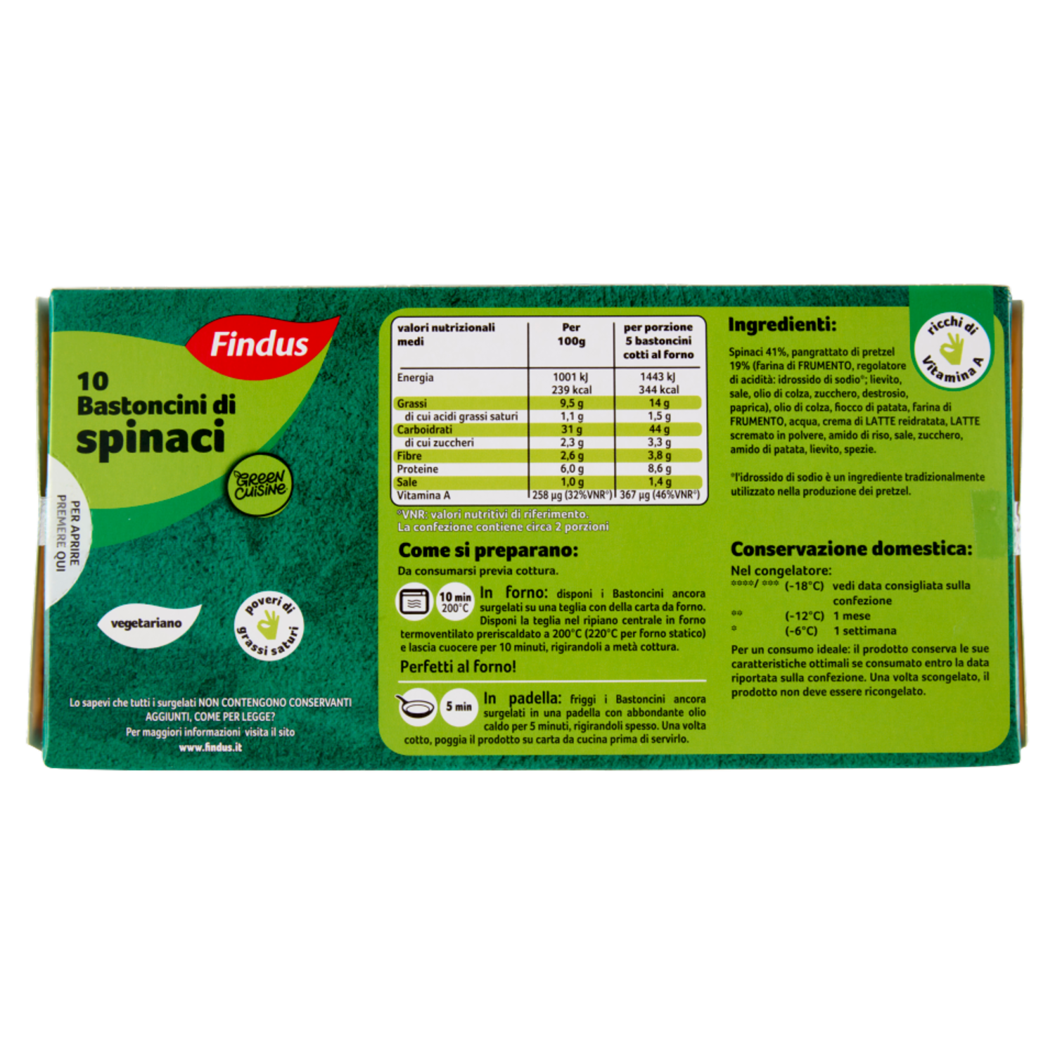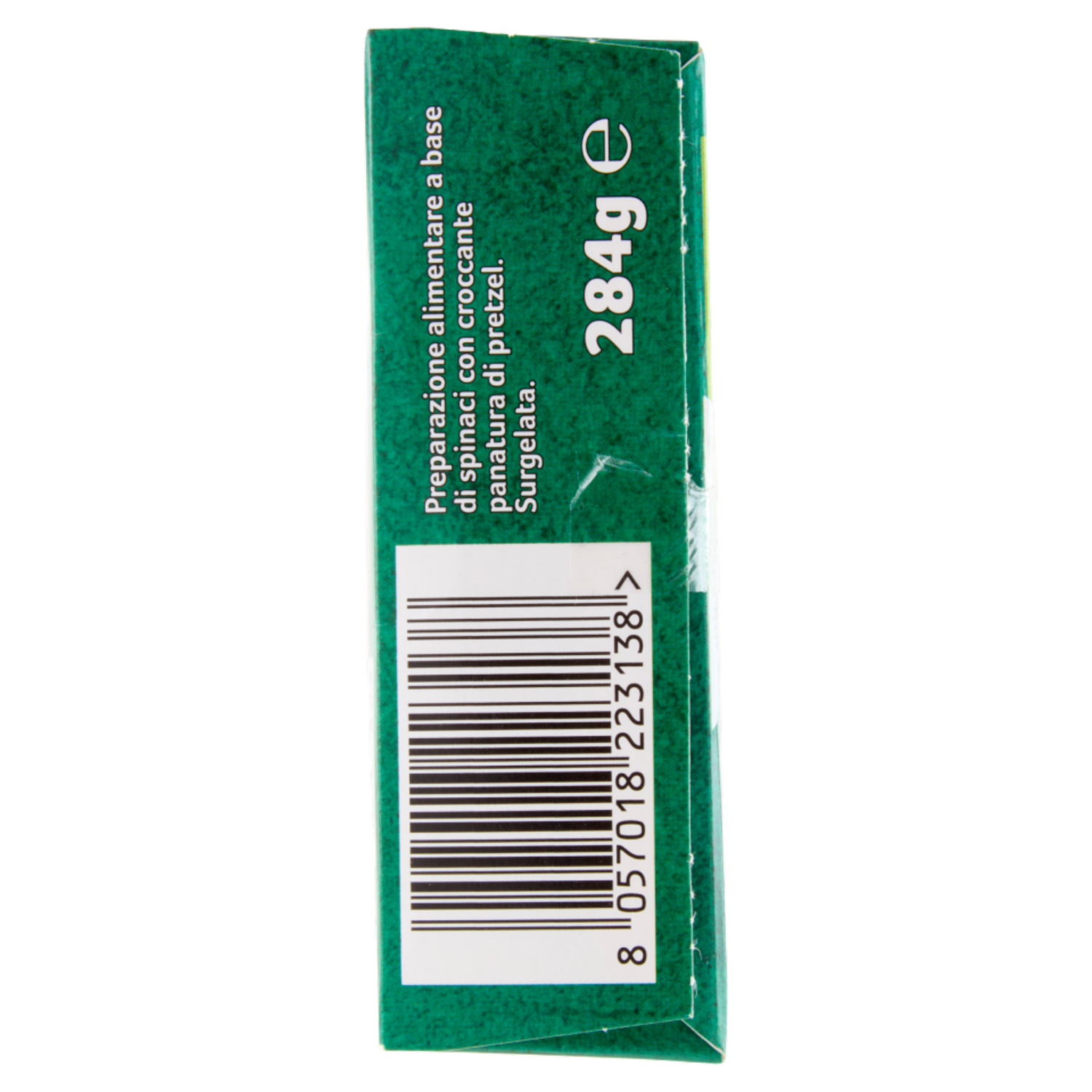 Preparazione alimentare a base di spinaci con croccante panatura di pretzel. Surgelata