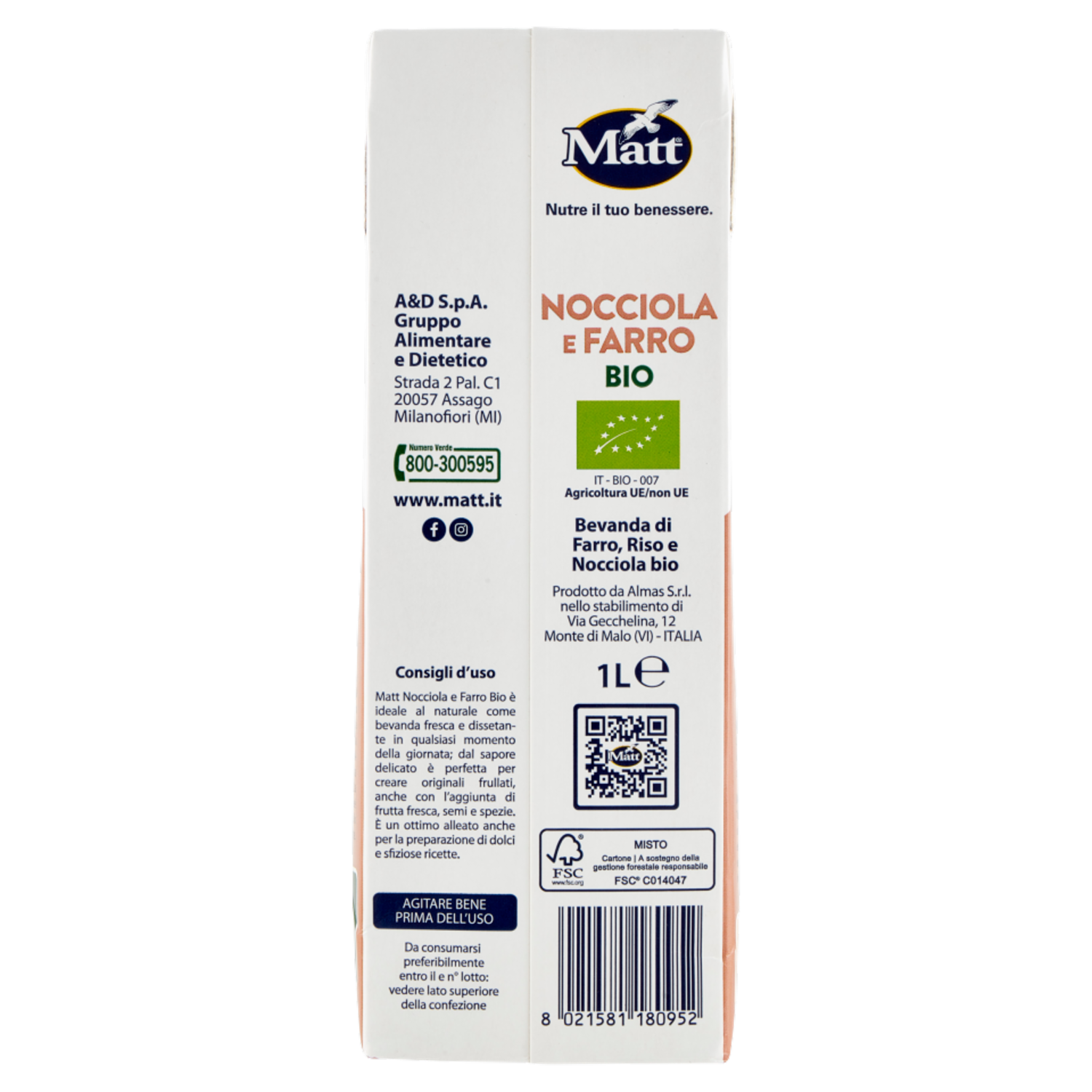 Consigli d'uso Matt Nocciola e Farro Bio è ideale al naturale come bevanda fresca e dissetante in qualsiasi momento della giornata; dal sapore delicato è perfetta per creare originali frullati, anche con l'aggiunta di frutta fresca, semi e spezie. È un ottimo alleato anche per la preparazione di dolci e sfiziose ricette. Agitare bene prima dell'uso 1. Apri 2. Chiudi 3. Agita Avvertenze Togliere il sigillo di plastica posto sotto il tappo, richiudere la confezione ed agitare bene prima dell'uso. L'eventuale presenza di piccoli grumi è segno di naturalità del prodotto; ciò non pregiudica in nessun modo il gusto e la sicurezza del prodotto.