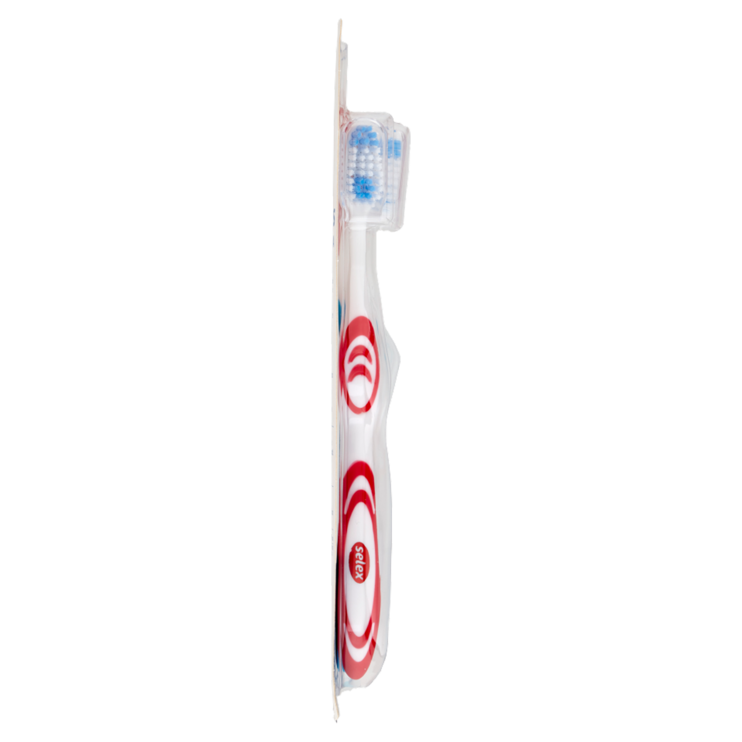 Selex Action Plus - Il passaggio dell'acqua attraverso i 6 fori della testina consente un risciacquo più efficace e quindi un'igiene superiore rispetto a uno spazzolino tradizionale. L'aria che passa nei fori inoltre permette un'asciugatura delle setole più rapida, riducendo la possibilità di formazioni batteriche. Testina compatta per una efficacia superiore in tutti i punti dell'arcata dentale. Manico anatomico, ma lineare, studiato per un facile e corretto uso dello spazzolino. La ricopertura in gomma antiscivolo rende la presa più sicura. Prodotto sterilizzato durante la fase di confezionamento.