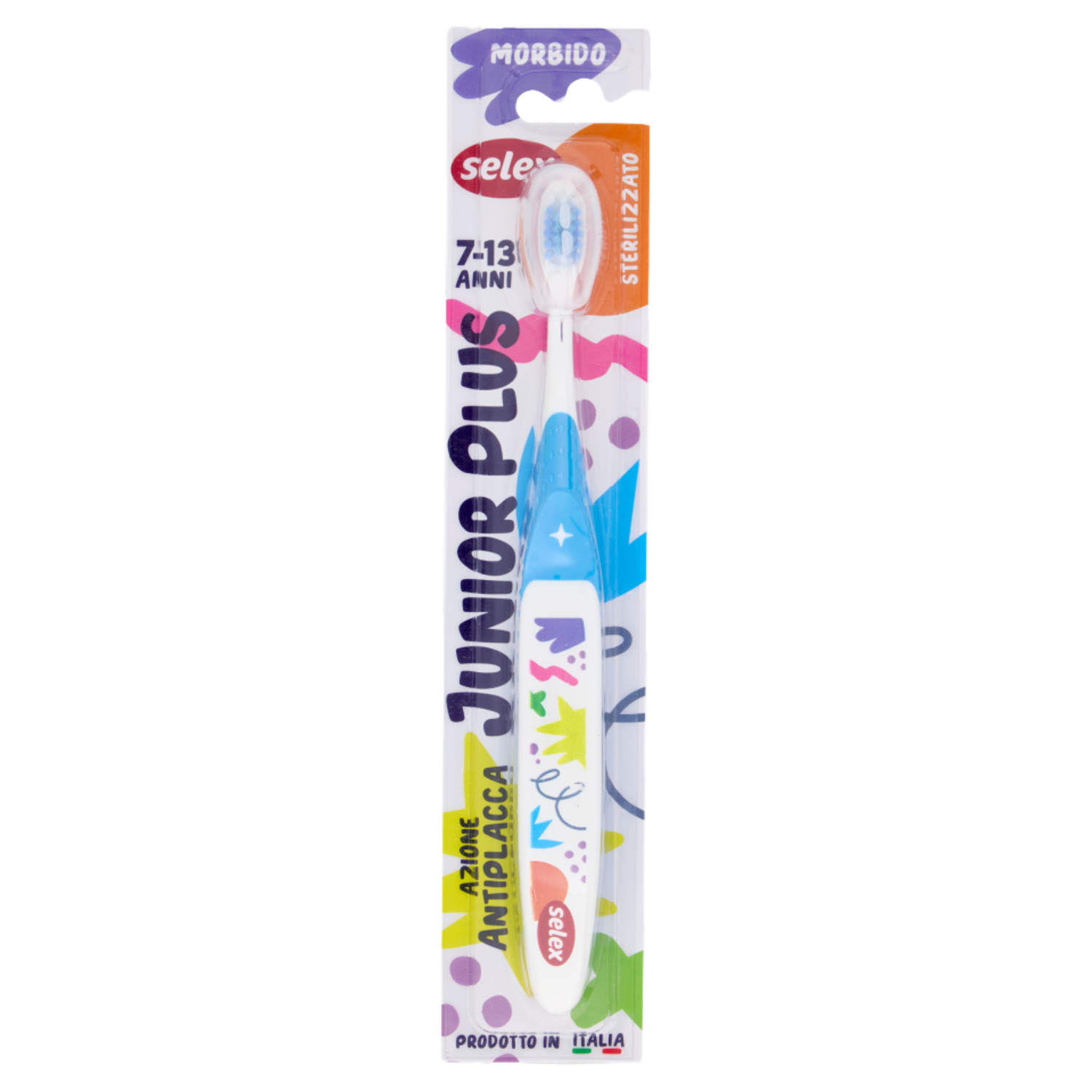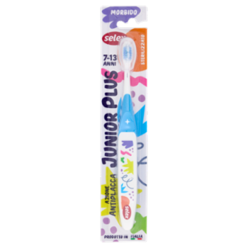 La testina compatta di Selex Junior Plus è ideale per l'arcata dentale del bambino. Setole con punte uniformemente arrotondate per un'azione antiplacca con il massimo rispetto di smalto e gengive, importante per prevenire la carie nello sviluppo dei denti in crescita. L'impugnatura antiscivolo, In morbida gomma garantisce una presa sicura per un ottimale utilizzo dello spazzolino. Prodotto sterilizzato durante la fase di confezionamento.