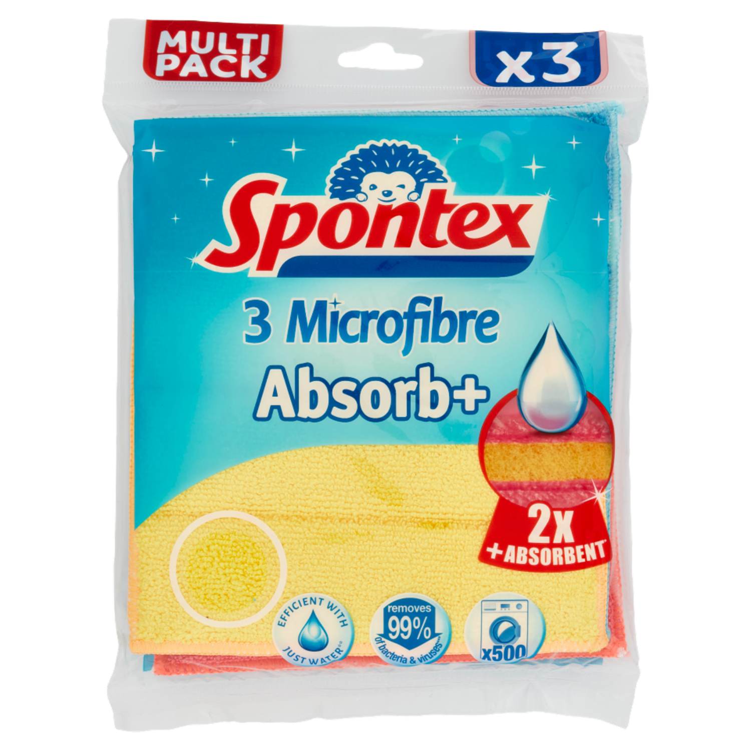 I panni Spontex Microfibre Absorb+ sono super resistenti e 2 volte più assorbenti* grazie alla combinazione con lo strato interno in spugna. *Basato su test interni. Comparato ai panni Spontex Microfibre Collection.