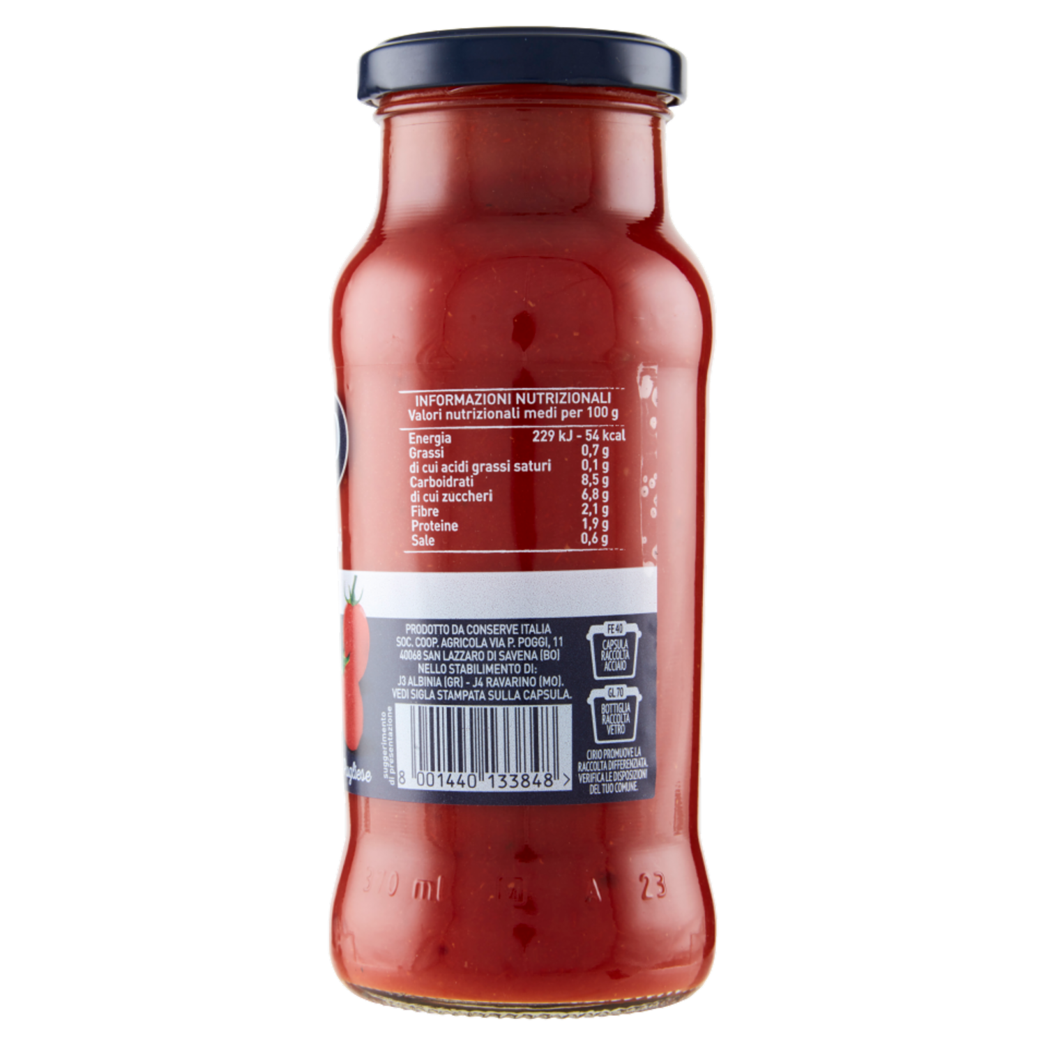 Prodotto da Conserve Italia Soc. Coop. Agricola Via P. Poggi, 11 40068 San Lazzaro di Savena (BO) nello stabilimento di: J3 Albinia (GR) V4 Ravarino (MO) Vedi sigla stampata sulla capsula