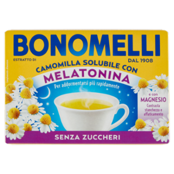 Bonomelli ha pensato per te questo prodotto che, oltre a conservare tutte le qualità dell'estratto di camomilla, contiene melatonina, che contribuisce alla riduzione del tempo richiesto per prendere sonno, e magnesio, che contribuisce alla riduzione della stanchezza e dell'affaticamento. L'effetto benefico della melatonina si ottiene con l'assunzione, poco prima di coricarsi, di 1 mg di melatonina