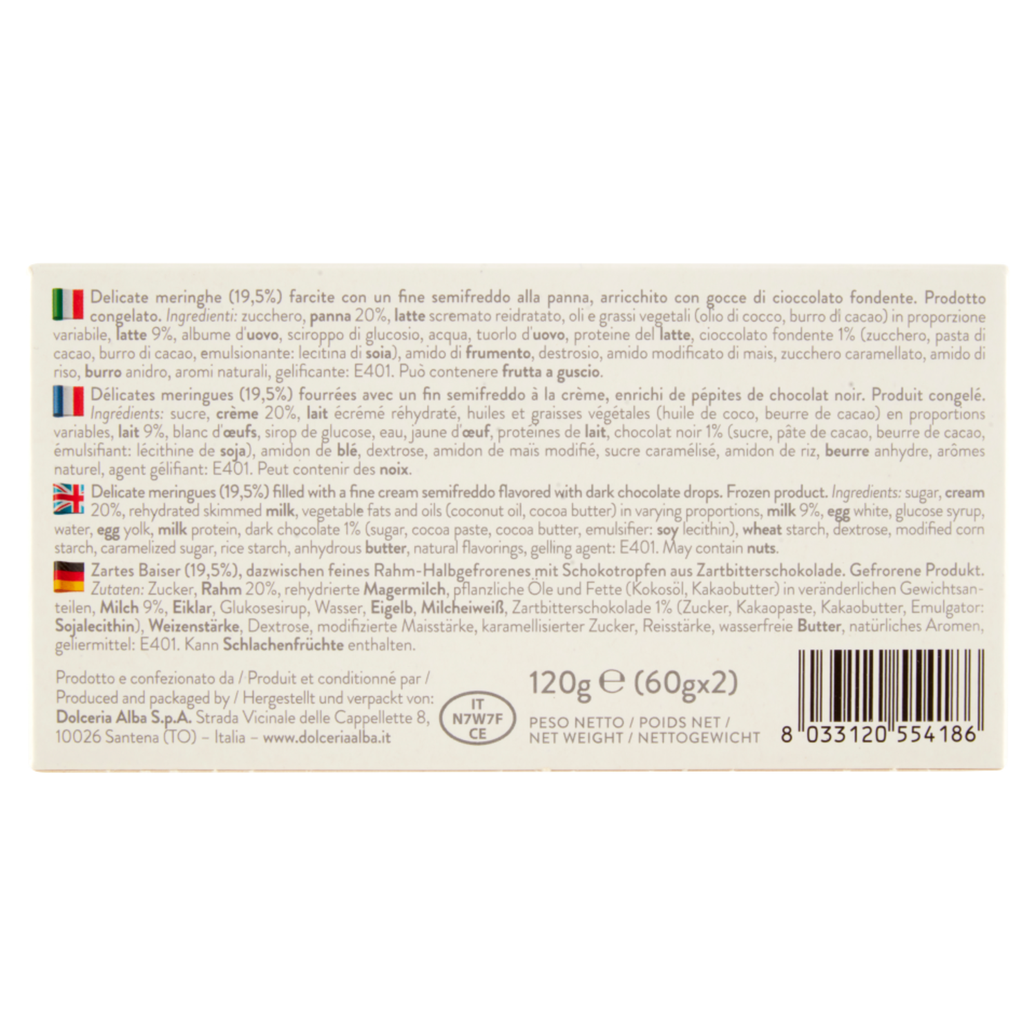 Prodotto e confezionato da: Dolceria Alba S.p.A. Strada Vicinale delle Cappellette 8 10026 Santena (TO) Italia