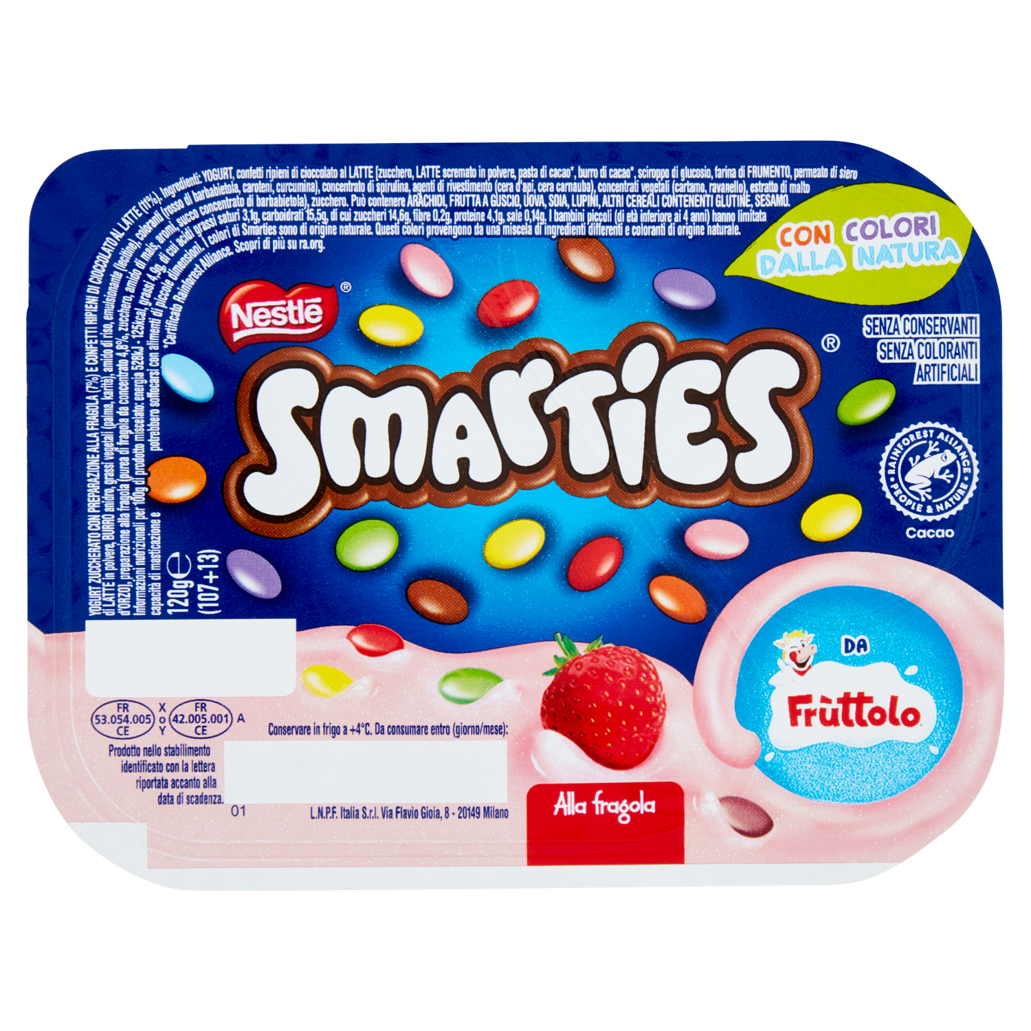 Yogurt zuccherato con preparazione alla fragola (7%) e confetti ripieni di cioccolato al latte (11%)