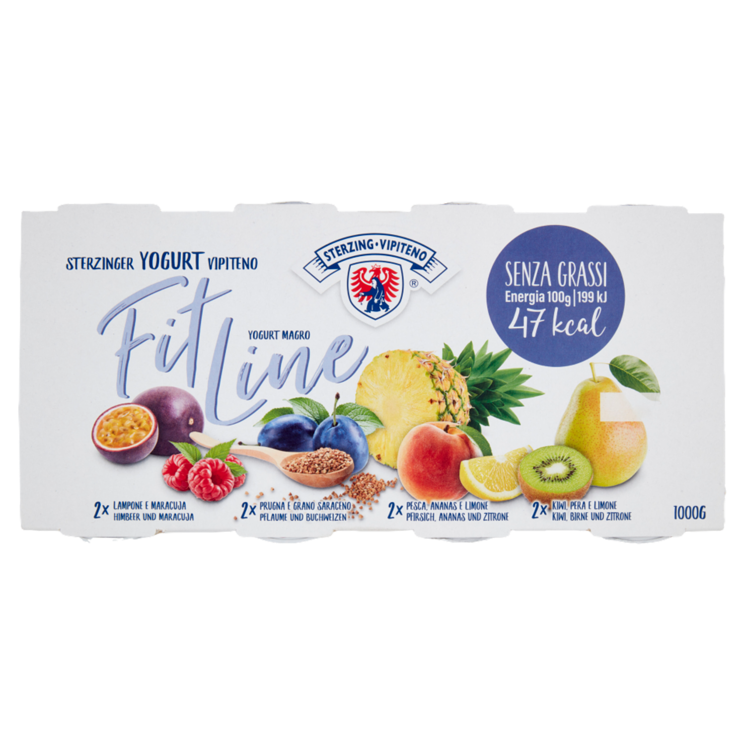 Yogurt magro al lampone e maracuja con edulcoranti Yogurt magro alla prugna e grano saraceno con edulcoranti Yogurt magro al kiwi, pera e limone con edulcoranti Yogurt magro alla pesca, ananas e limone con edulcoranti