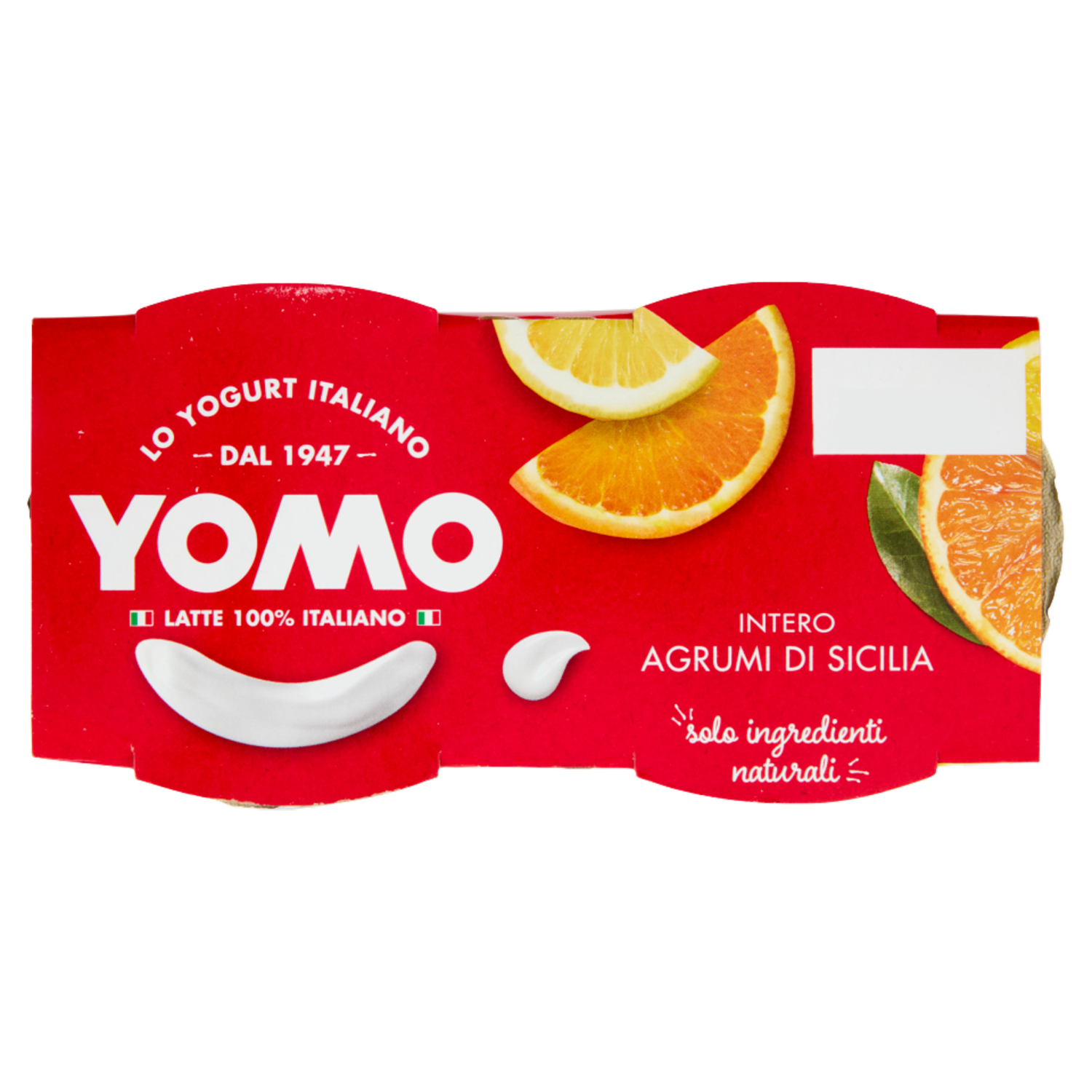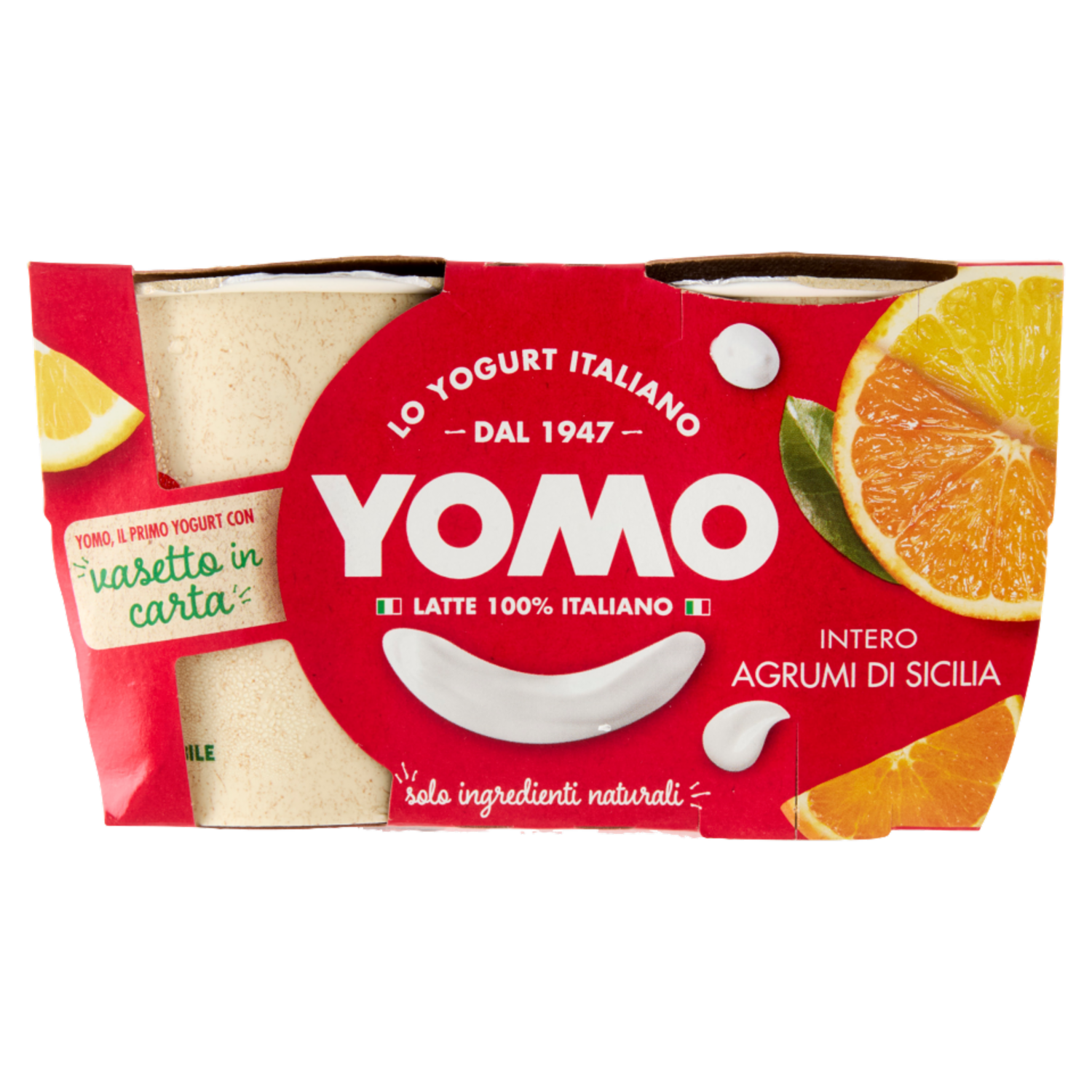 Yomo Agrumi di Sicilia è cremoso e goloso, con ingredienti tutti naturali! Latte italiano di filiera Solo latte italiano della filiera Granarolo e benessere animale certificato in allevamento* *DTP 142 - Cert CSQA n.53446 Vasetto in carta Tutti i vasetti Yomo 125g x 2 sono in carta