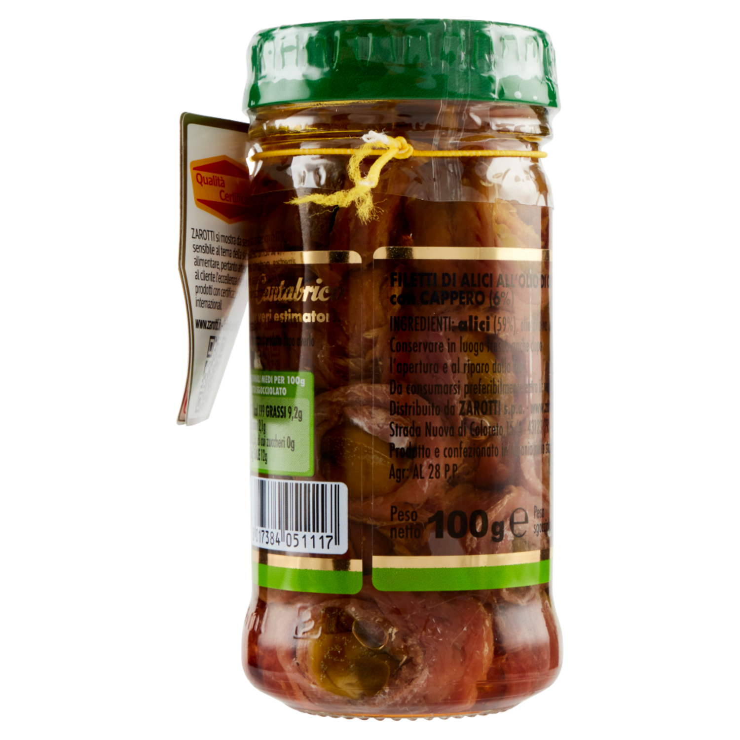 Filetti di alici all'olio d'oliva Una della migliori qualità di alici del mondo sono pescate nel nord della Spagna, nelle acque profonde del Mar Cantabrico, acque fredde e ricche di plancton. Qui Zarotti si approvvigiona di questa particolare qualità pescata nel periodo primaverile. La lavorazione ad oggi, è ancora completamente manuale e svolta con cura e antica sapienza, che rende l'alice più tenera e gustosa. Zarotti garantisce così il controllo della qualità e l'alto pregio del prodotto finale, ideale per aperitivi e stuzzicanti antipasti. Selezione Cantabrico l'eccellenza, per veri estimatori.