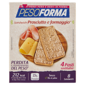 Pesoforma offre una grande varietà di pasti sostitutivi completi ed equilibrati, con poche calorie e senza rinunciare al gusto L'alleato della tua linea... - Ricco in proteine*: 25% - Con fibre - 212 kcal per pasto Attento al tuo benessere... - Con 13 vitamine e 11 minerali* E amico dell'ambiente... - Senza olio di palma Per il tuo pesoforma° sostituisci il pasto con un goloso sandwich al prosciutto e formaggio Sono pratici e puoi portarli sempre con te per un pranzo a solo 212 kcal. Sono sviluppati appositamente per essere inseriti in una dieta ipocalorica. Scopri i piani dieta su pesoforma.com Perdita e Mantenimento del Peso* Fonte: EFSA (European Food Safety Authority) *Valido per la categoria dei sostituti del pasto per il controllo del peso °Scegli uno stile di vita sano: mangia in modo vario ed equilibrato, bevi almeno due litri di acqua al giorno e pratica regolarmente attività fisica, ti sentirai più in forma. Per perdere peso, sostituisci due pasti principali al giorno con Pesoforma; per mantenere il peso sostituisci un pasto al giorno, nell'ambito di una dieta ipocalorica che comprenda anche altri alimenti. Ti consigliamo di chiedere un parere medico se desideri consumare il prodotto per più di tre settimane consecutive.