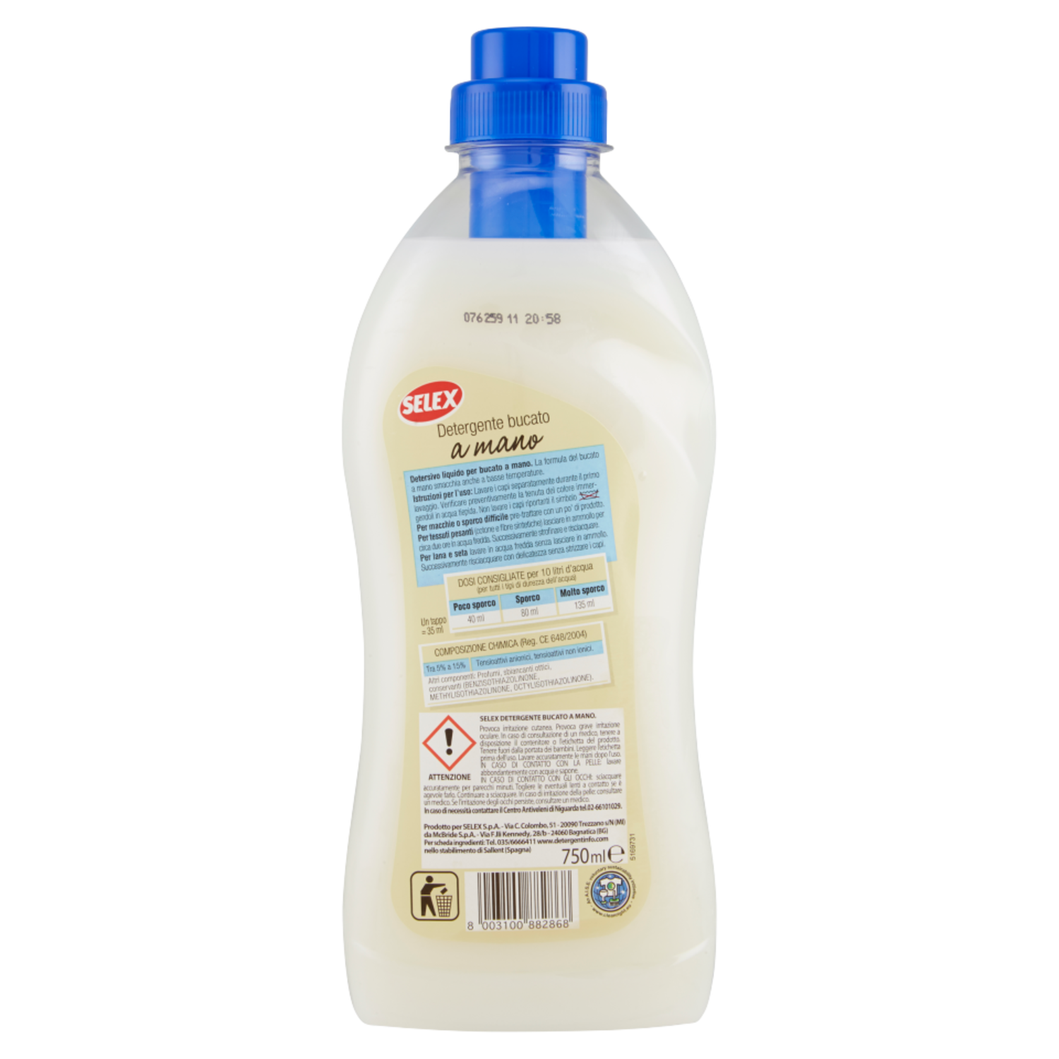 Attenzione Selex detergente bucato a mano. Provoca irritazione cutanea. Provoca grave irritazione oculare. In caso di consultazione di un medico, tenere a disposizione il contenitore o l'etichetta del prodotto. Tenere fuori dalla portata dei bambini. Leggere l'etichetta prima dell'uso. Lavare accuratamente le mani dopo l'uso. IN CASO DI CONTATTO CON LA PELLE: lavare abbondantemente con acqua e sapone. IN CASO DI CONTATTO CON GLI OCCHI: sciacquare accuratamente per parecchi minuti. Togliere le eventuali lenti a contatto se è agevole farlo. Continuare a sciacquare. In caso di irritazione della pelle: consultare un medico. Se l'irritazione degli occhi persiste, consultare un medico. In caso di necessità contattare il Centro Antiveleni di Niguarda tel.02-66101029.