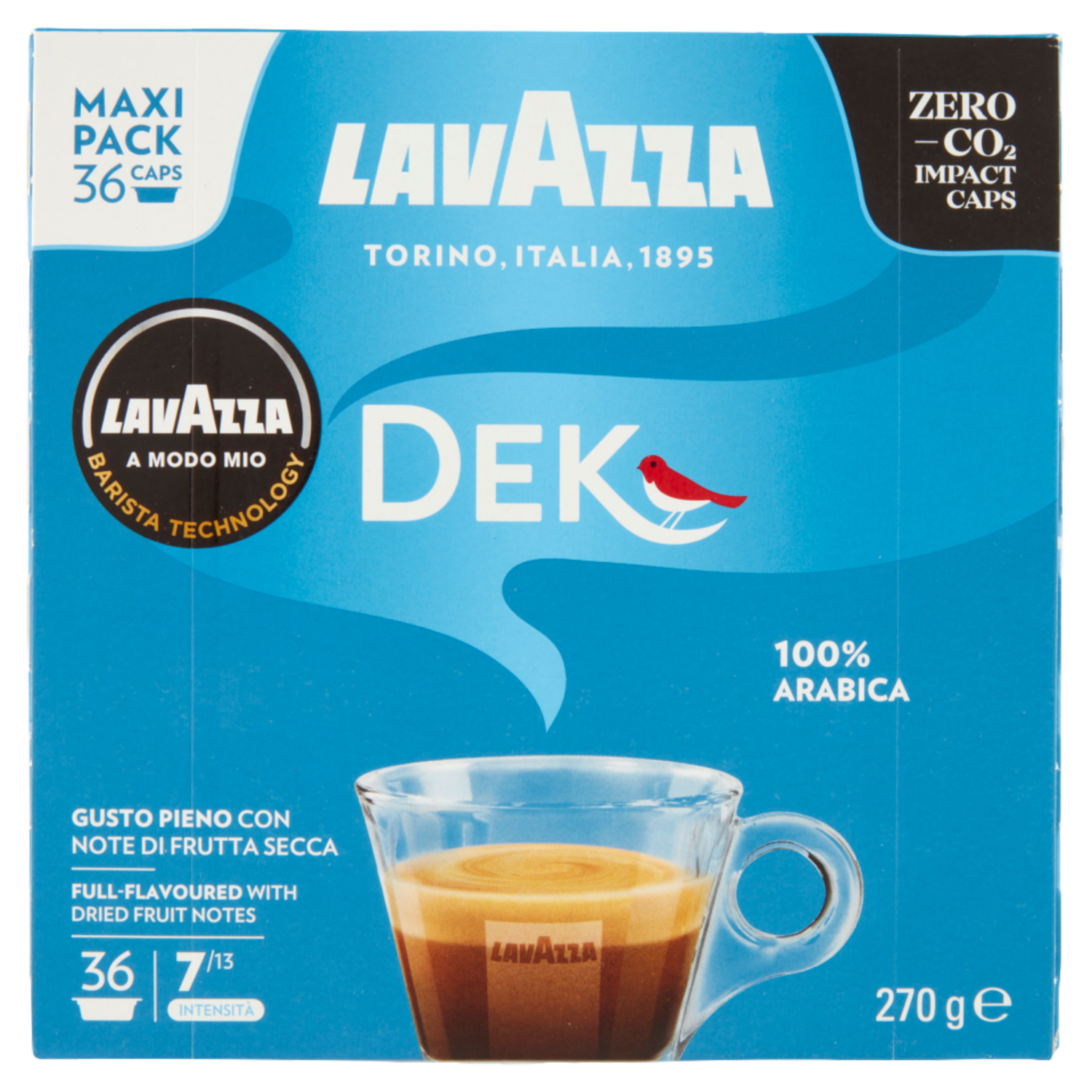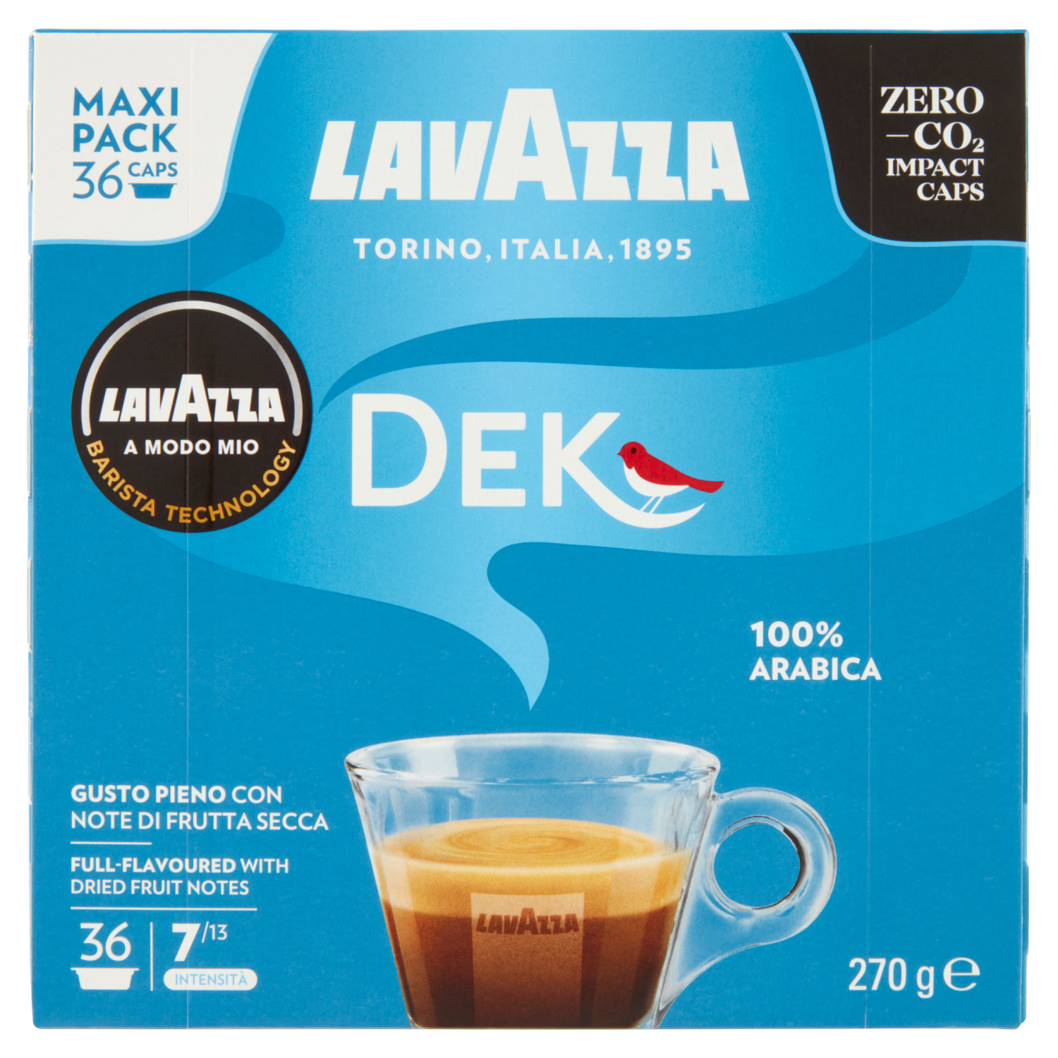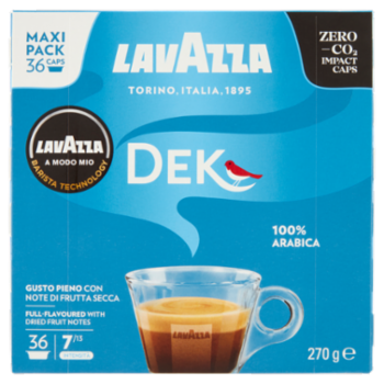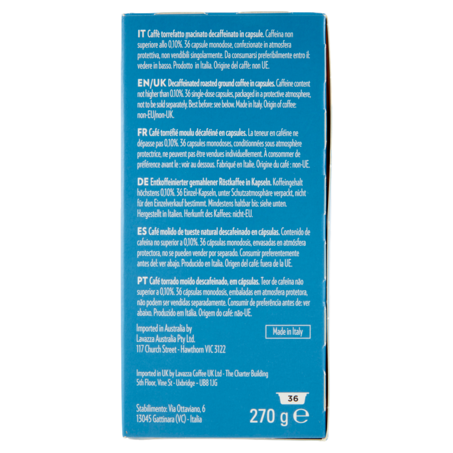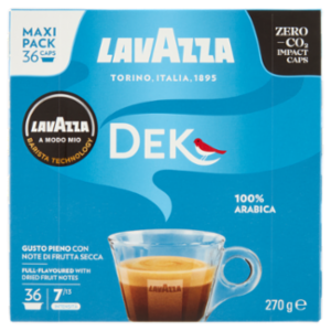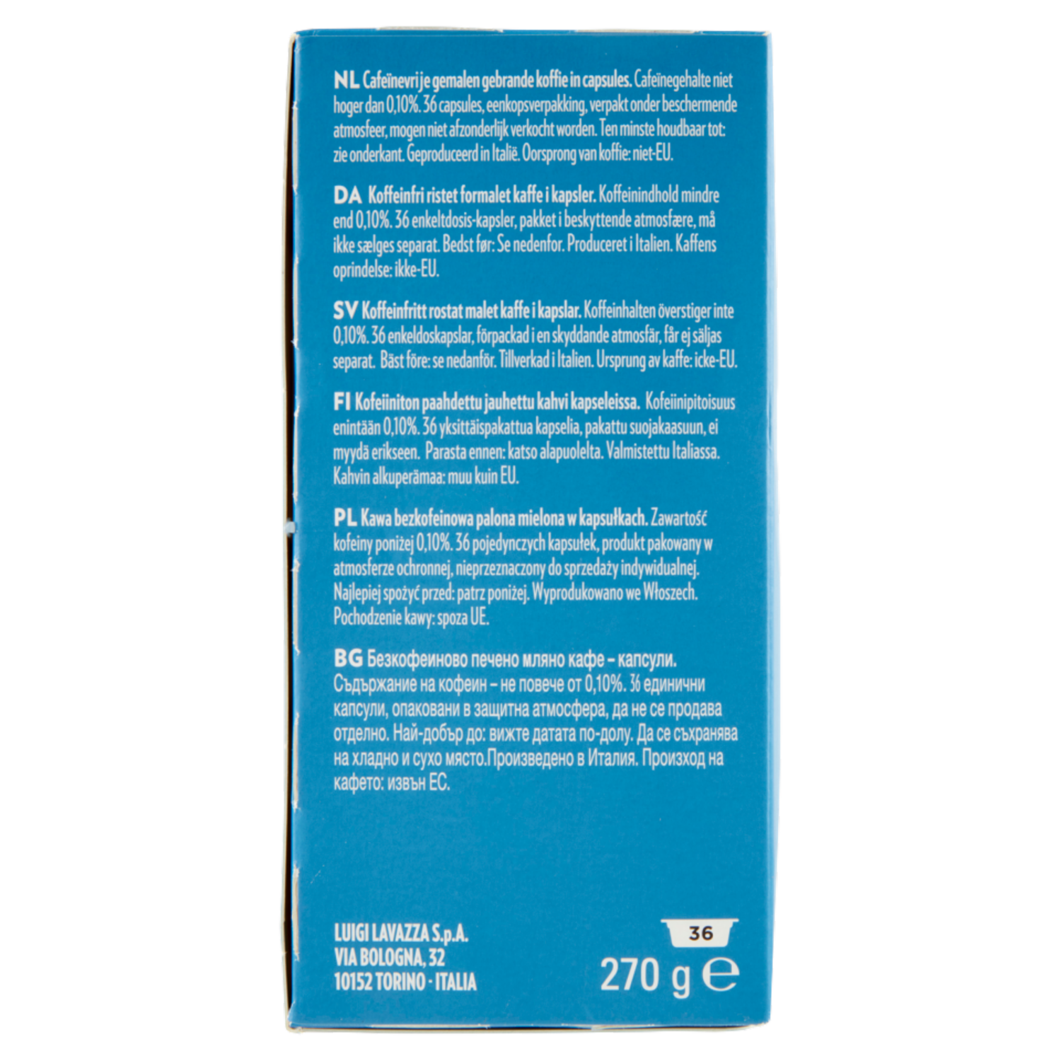 Caffè torrefatto macinato decaffeinato in capsule. Caffeina non superiore allo 0,10%. 36 capsule monodose, confezionate in atmosfera protettiva, non vendibili singolarmente
