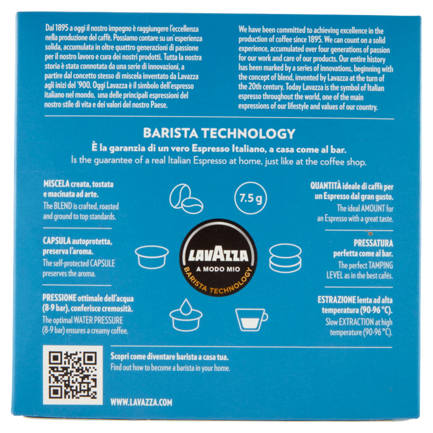 Barista technology È la garanzia di un vero Espresso Italiano, a casa come al bar. Miscela creata, tostata e macinata ad arte. Capsula autoprotetta, preserva l'aroma. Pressione ottimale dell'acqua (8-9 bar), conferisce cremosità. Quantità ideale di caffè per un Espresso dal gran gusto. Pressatura perfetta come al bar. Estrazione lenta ad alta temperatura (90-96 °C). Scopri come diventare barista a casa tua. www.lavazza.com